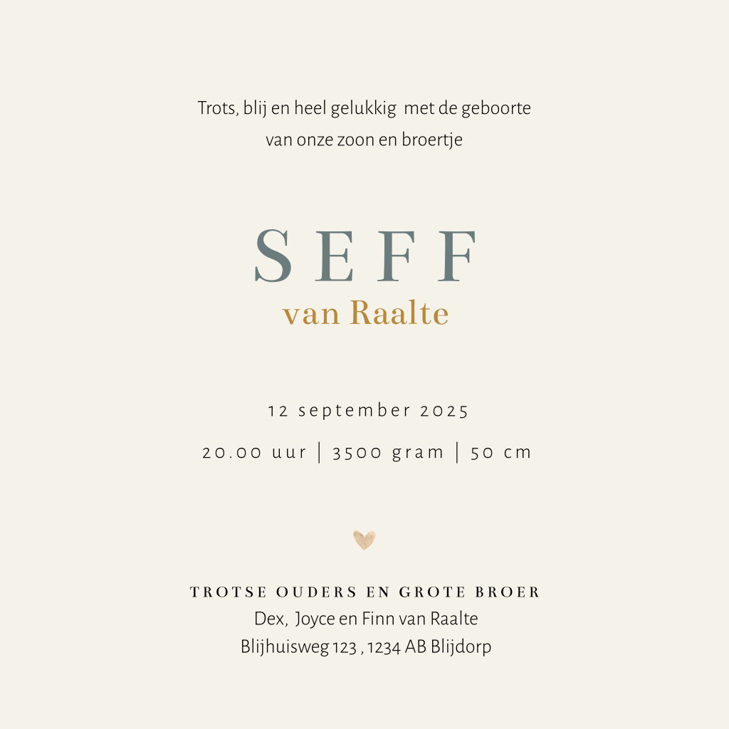 Silhouet geboortekaartje voor een tweede zoon. Op dit jongenskaartje met de naam Seff staan 2 broertjes hand in hand. Er is gebruikt gemaakt van trendy kleuren die helemaal van nu zijn. Op de achtergrond een landelijke sfeer en vrolijke zonnestralen. Pas dit kaartje naar je eigen smaak aan in de editor. Ook mogelijk voor een andere gezinssamenstelling.