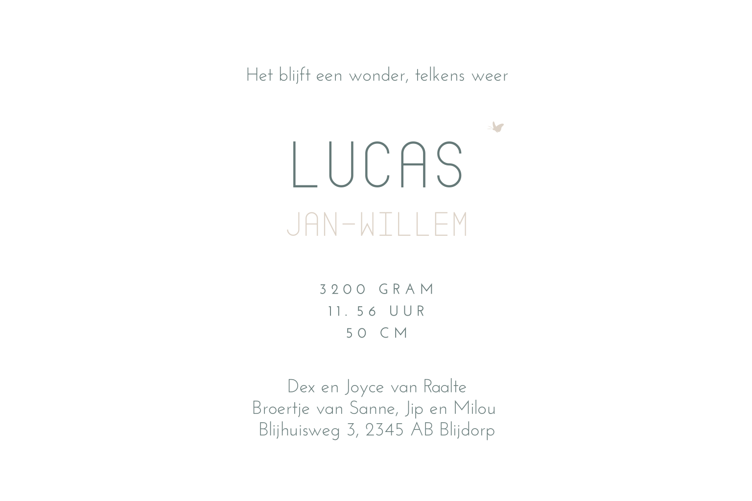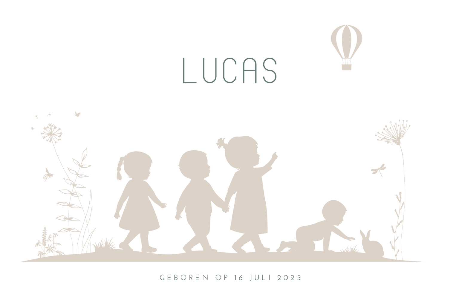 Lief silhouet geboortekaartje voor een vierde kindje, een broertje. Op dit babykaartje met de naam Lucas, zie je een kruipend jongetje, samen met twee grote zussen en een grote broer tussen de mooie veldbloemen. In de lucht een luchtballon en in het gras een klein konijntje. Een lief en vrolijk kaartje voor een groot gezin, erg geschikt voor een broertje die in de lente of in de zomer geboren wordt. Pas dit kaartje naar je eigen smaak aan in de editor.