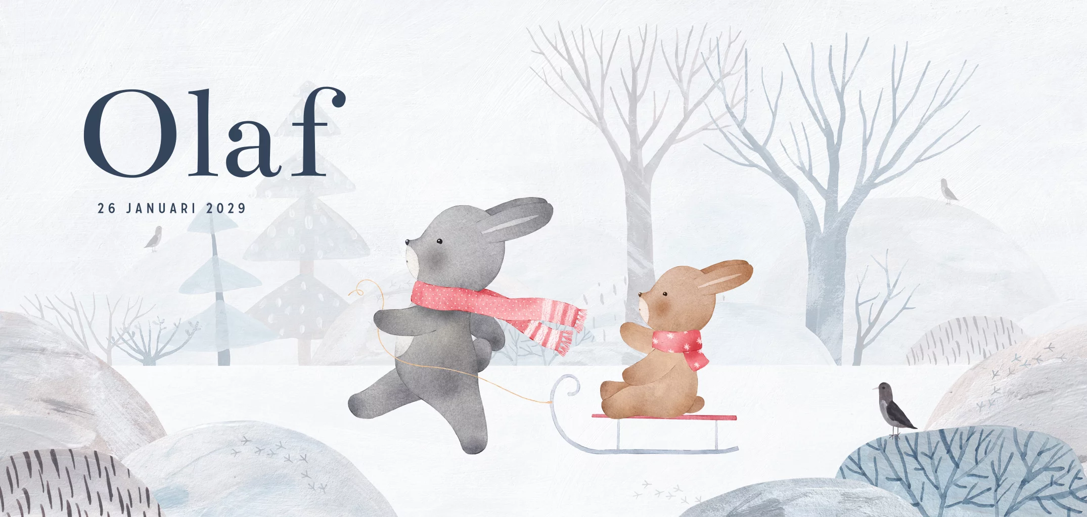 Verwachten jullie een tweede kindje in de winter? Kies dan voor dit winter geboortekaartje voor een jongen, een broertje! Op dit geboortekaartje Olaf zie je twee konijntjes in de sneeuw. Grote broer of zus trekt het kleine broertje mee op de slee door een winterlandschap.