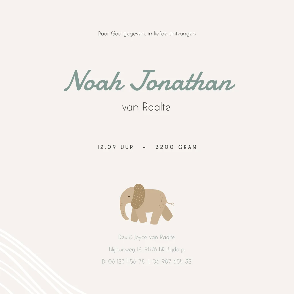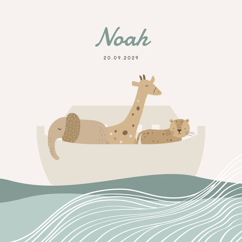 Christelijk geboortekaartje in een trendy jasje. Dit jongenskaartje Noah heeft een beige achtergrond met een illustratie van de ark van Noach met dieren, waaronder een olifant en giraffe. Het bootje vaart op een groen blauwe zee met een lijntekening van witte golven. Pas de teksten, kleuren en lettertypes naar je eigen smaak aan in de editor.
