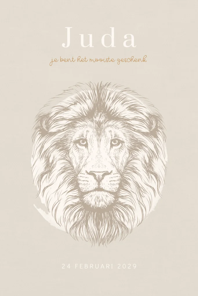 Een uniek geboortekaartje voor jouw kleine man: een christelijk geboortekaartje met een tekening van een leeuw. De rustige nude kleuren en ronde hoeken zijn helemaal volgens de trend van nu. Pas de teksten en kleuren op dit kaartje Juda eenvoudig aan in de editor.