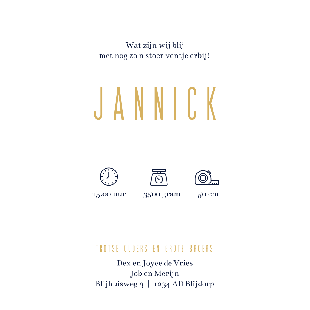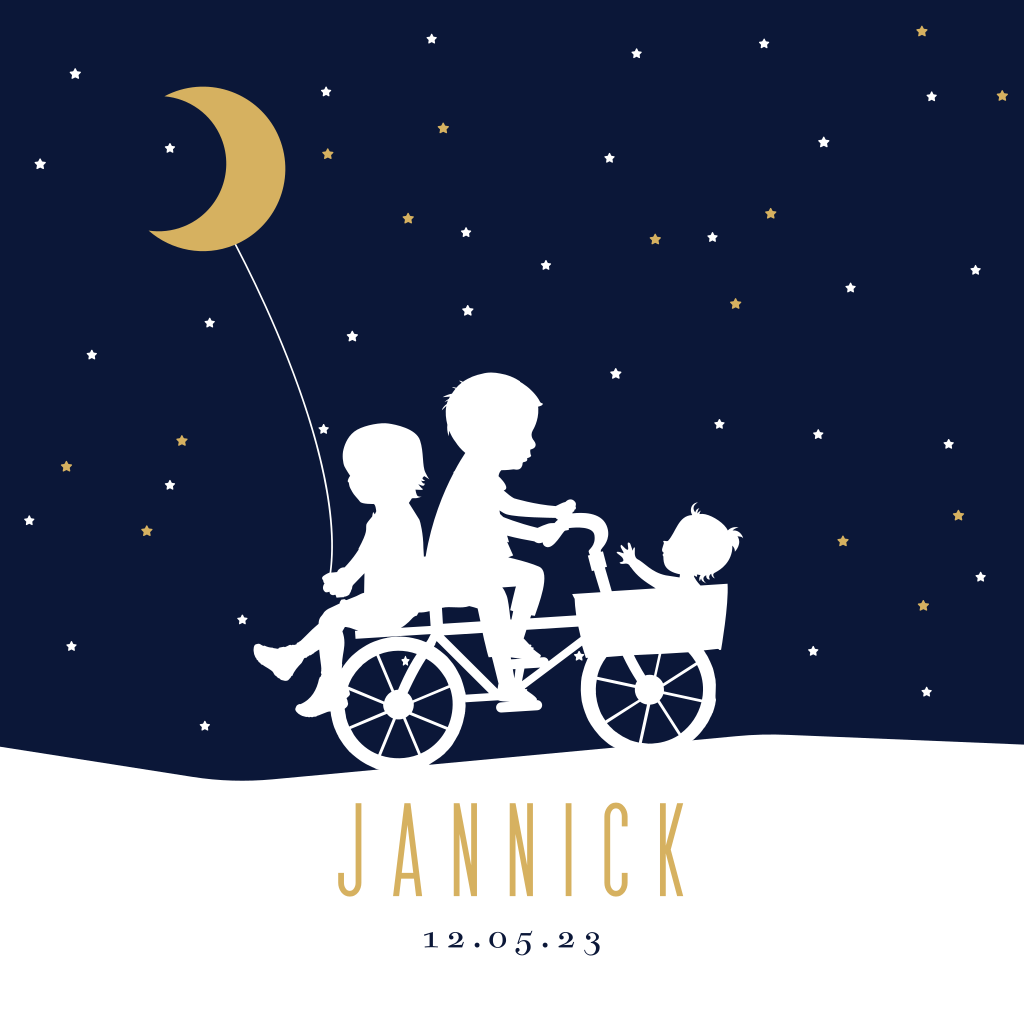 Geboortekaartje voor een derde jongen met een maan en sterren. Op dit kaartje Jannick staat een silhouet van 2 grote broers samen met een baby broertje op de fiets. Een mooie kleurencombinatie van donkerblauw met wit en goudkleur. De teksten en kleuren kun je aanpassen in de editor. Ook mogelijk met een ander silhouet of andere gezinssamenstelling.
