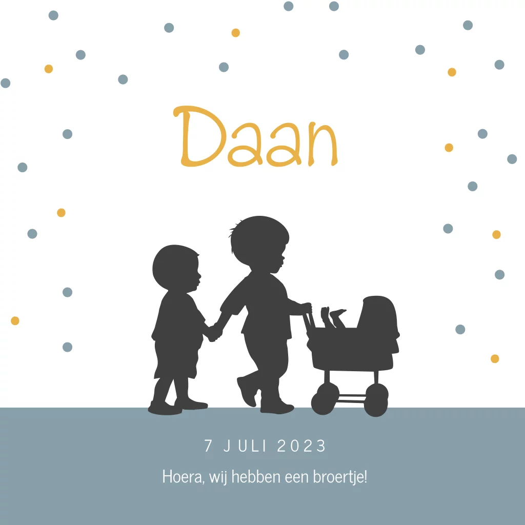 Hip silhouet geboortekaartje voor een derde zoon. Op dit kaartje staan twee broertjes hand in hand aan de wandel met een klein baby broertje in de kinderwagen. De kleuren van dit kaartje en het silhouet zijn aan te passen.
