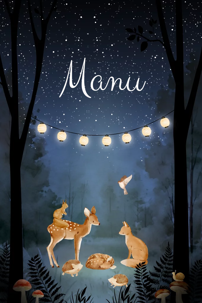 Bijzonder geboortekaartje voor een jongen. Dit geboortekaartje zal zeker opvallen door de rijke donkere kleuren. Je ziet op dit babykaartje Manu een hertje, vos, eekhoorn en egel in het bos. Ze zitten onder de sterren en gezellige lampionnen. De goudfolie geeft een mooie glans aan het kaartje. Personaliseer het kaartje met jullie eigen tekst en maak het helemaal af.