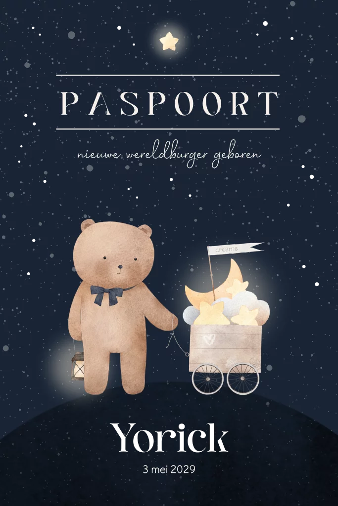 Schattig beren geboortekaartje voor een jongen in de vorm van een paspoort. Op de voorkant van het kaartje zie je een knuffelbeertje die een kar heeft vol met dromen, de maan en de sterren. Dit jongenskaartje Yorick heeft een donker design wat de nacht uitbeeld. De goudfolie heeft een mooie glans en geeft deze kaart een luxe uitstraling.