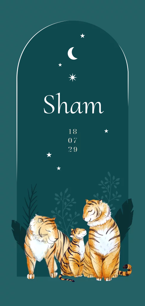 Prachtig geboortekaartje voor een jongen met een tijger illustratie. Je ziet een tijger gezin onder de maan en sterren. Dit babykaartje Sham heeft een mooie groene tint met omrand kader en goudfolie. De folie geeft een luxe touch en glans aan het kaartje. Pas het ontwerp eenvoudig aan in onze online editor.