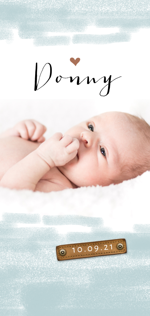Lief hip geboortekaartje met eigen foto, aquarel vegen en leren label op de voorkant. Op de achterkant van het babykaartje Donny staan de geboortegegevens ook in leren labeltjes