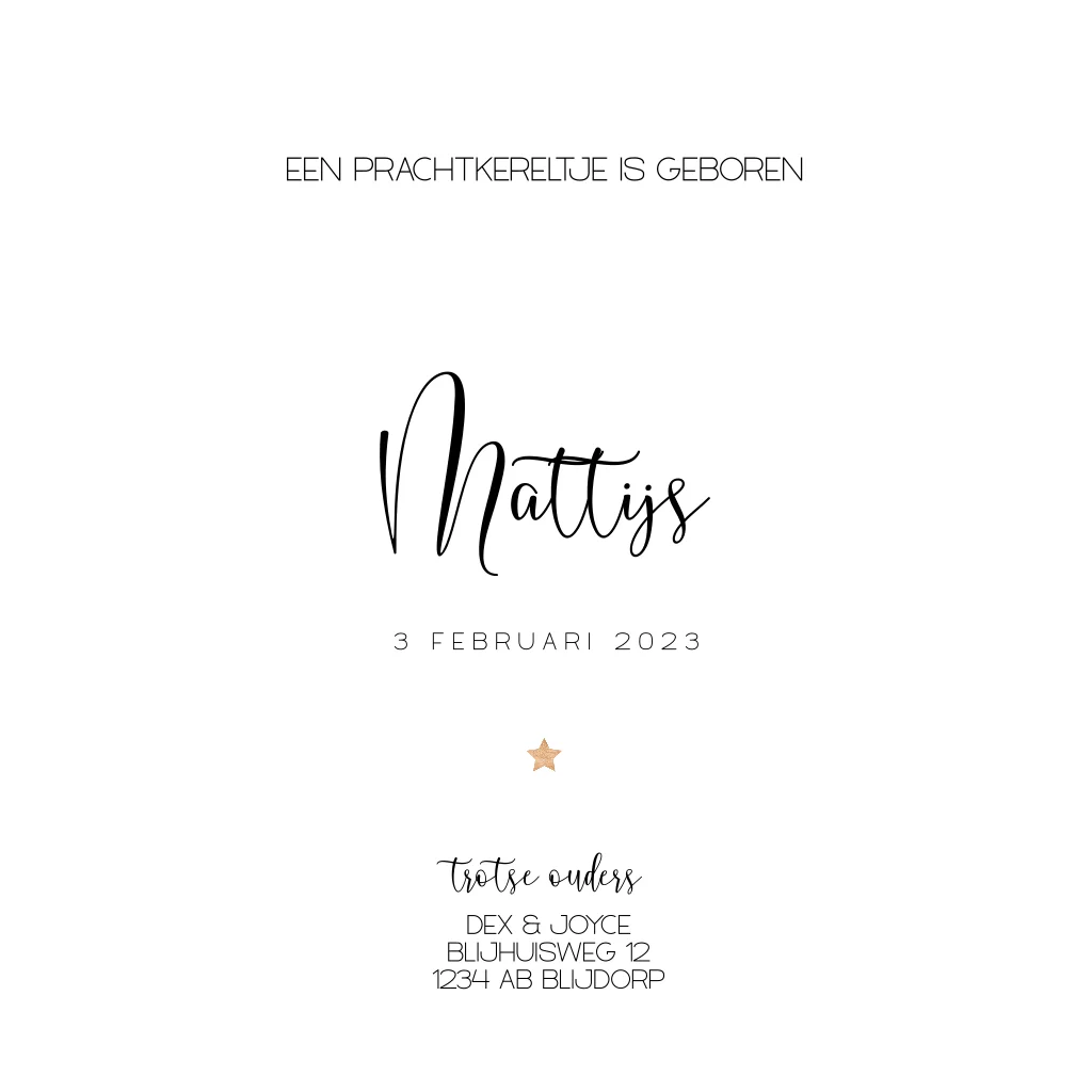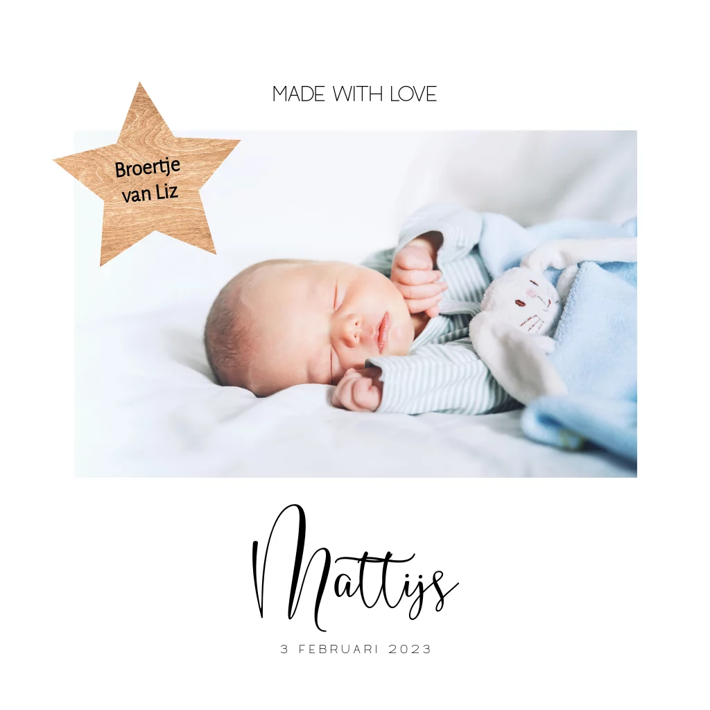 Lief geboortekaartje met eigen foto en houten ster. Dit babykaartje Mattijs kun je gebruiken voor zowel een jongen als een meisje. De geboortegegeven aan de binnenkant zijn weergegeven met houten symbolen.