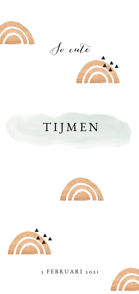 Hip geboortekaartje met patroon van houten regenboog. Op de achterkant van dit jongenskaartje Tijmen zijn de geboortesymbolen ook van hout