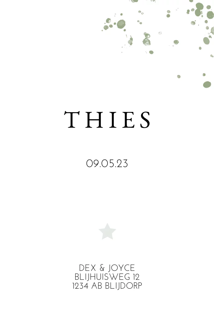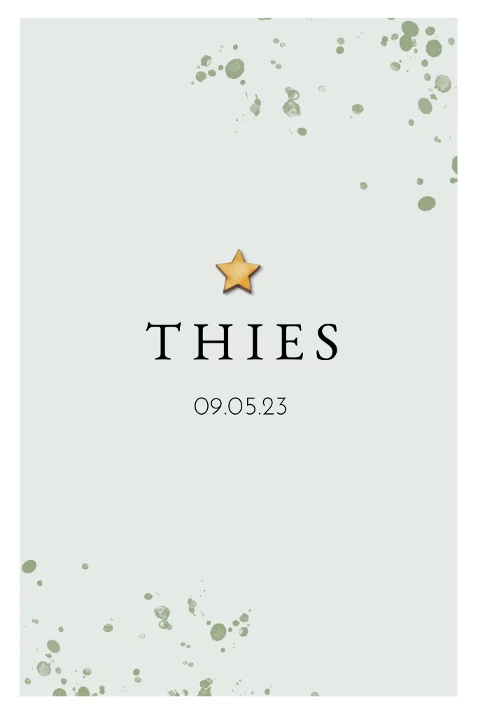 strak geboortekaartje met spetters. Op de voorkant van dit kaartje Thies zit een echt houten sterretje wat de kaart extra mooi maakt.