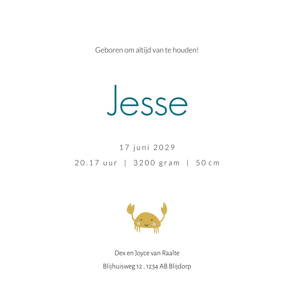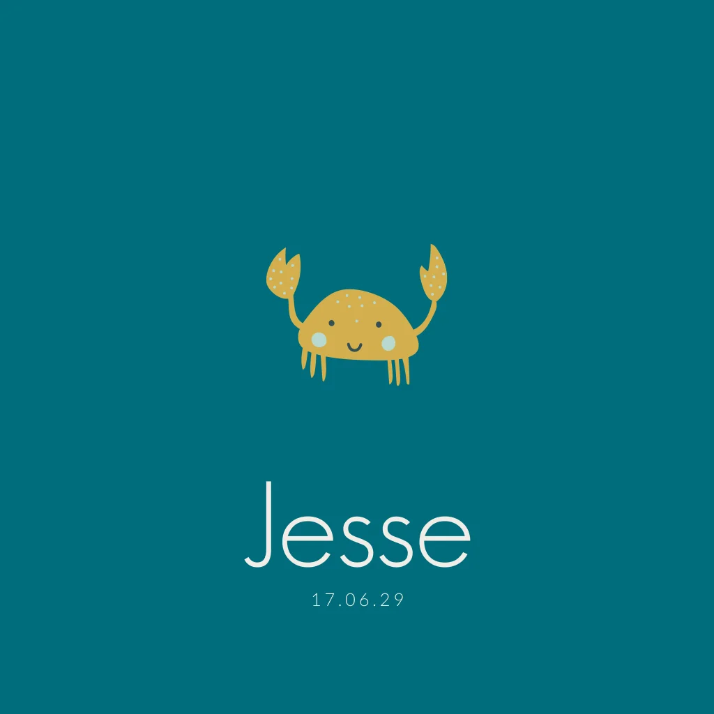 Geboortekaartje Jesse is unisex en dus geschikt voor zowel een jongen als meisje. Op de voorzijde staat een grappig en schattig krabbetje.