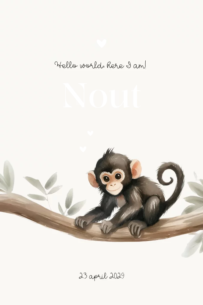 Een lief geboortekaartje voor een jongen. Dit geboortekaartje Nout heeft een schattig design van een babyaapje op een tak. De ronde hoeken zorgen voor een speels effect. Het goudfolie zorgt voor een extra vleugje luxe. Het gehele geboortekaartje voor jullie zoon is naar eigen wens aan te passen in onze online editor. Hulp nodig met ontwerpen? Ons team staat voor je klaar.