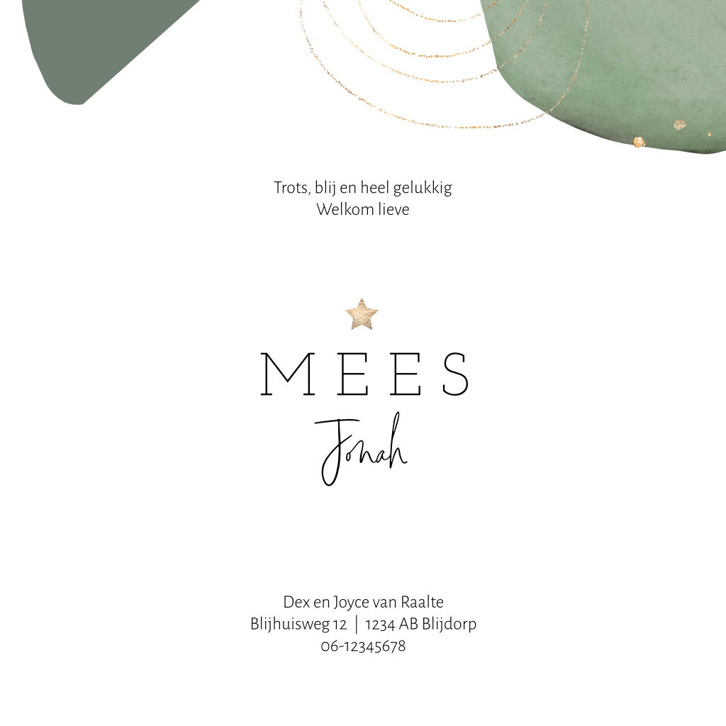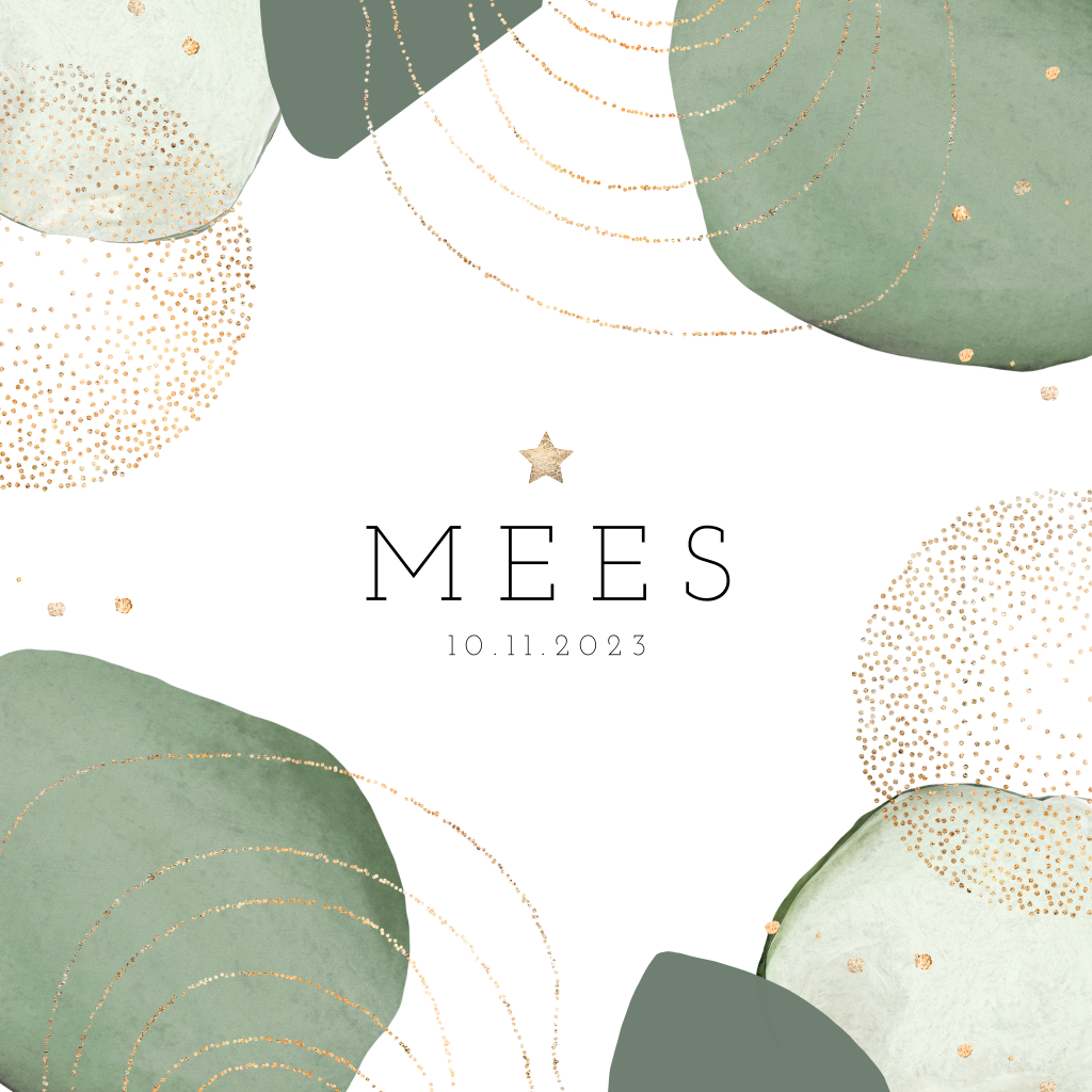Geboortekaartje Mees voor een jongen met abstracte aquarel vormen in trendy groene tinten en goudkleurige cirkels. Wil je liever andere kleuren of lettertypes? Pas het kaartje eenvoudig aan in de editor, waardoor het helemaal jullie eigen, unieke kaartje wordt.