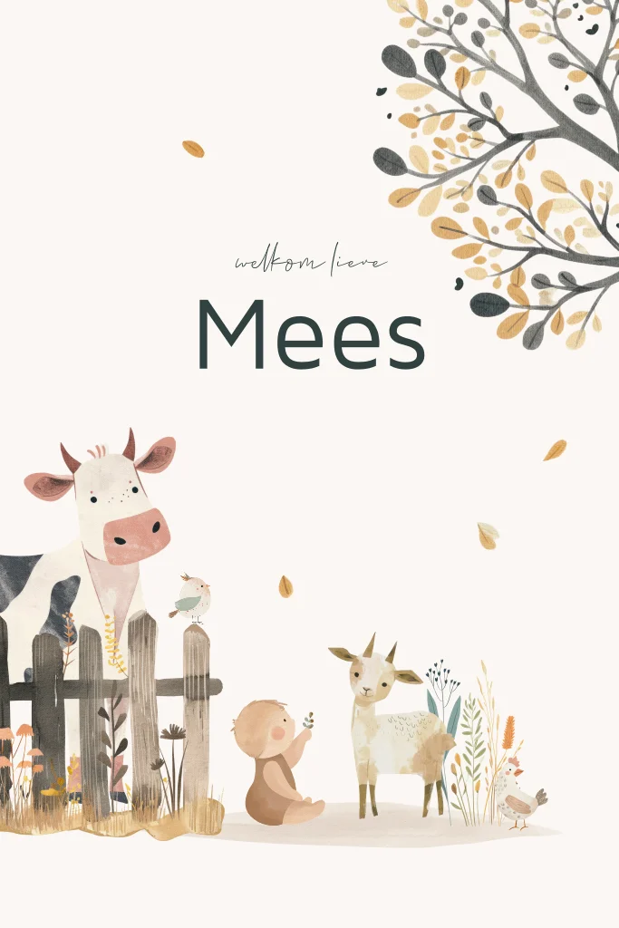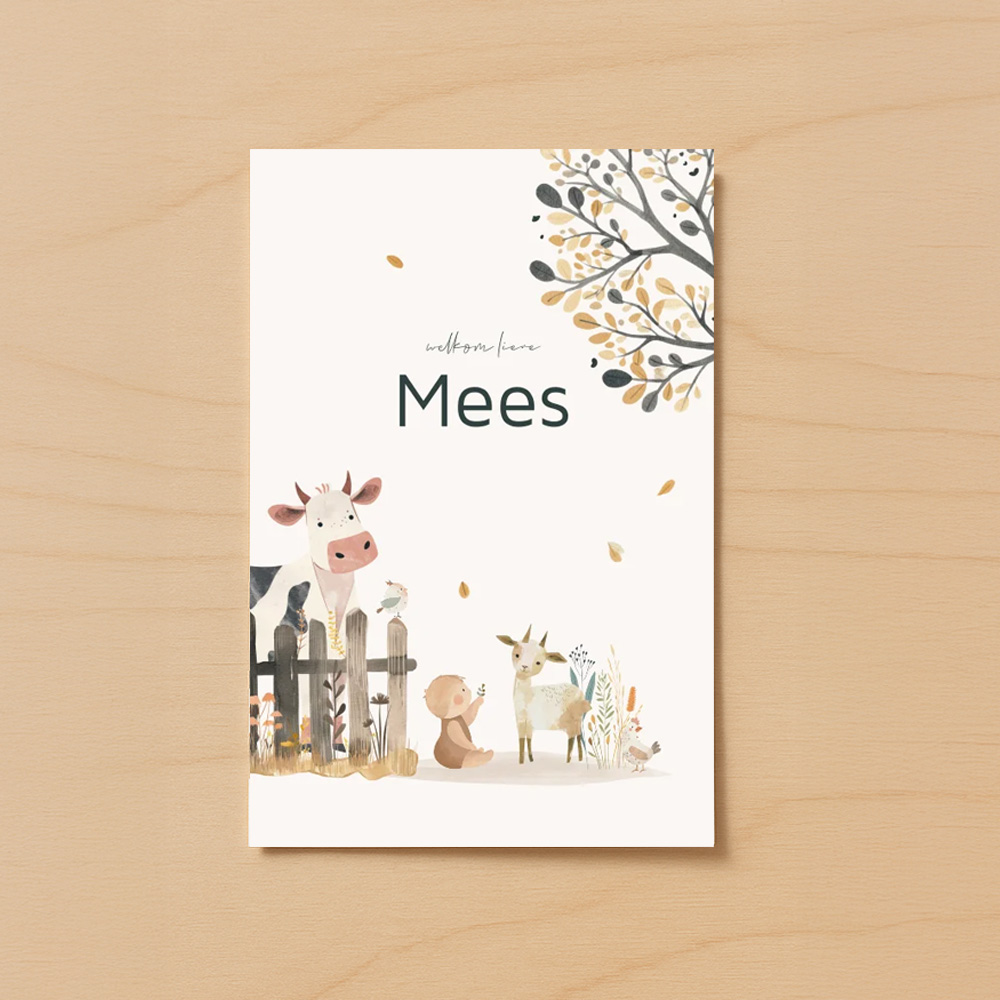 Herfst geboortekaartje met een aquarel illustratie van een schattige baby met boerderijdieren zoals een koe, geit en kip. Op de achtergrond zie je een boom waarvan de bladeren afvallen. De warme herfsttinten en de zachte, getekende details geven een lieflijke en natuurlijke uitstraling aan dit unieke kaartje Mees. Pas de teksten, lettertypes en kleuren eenvoudig aan in de editor. Hulp nodig bij het ontwerpen? Neem contact met ons op!