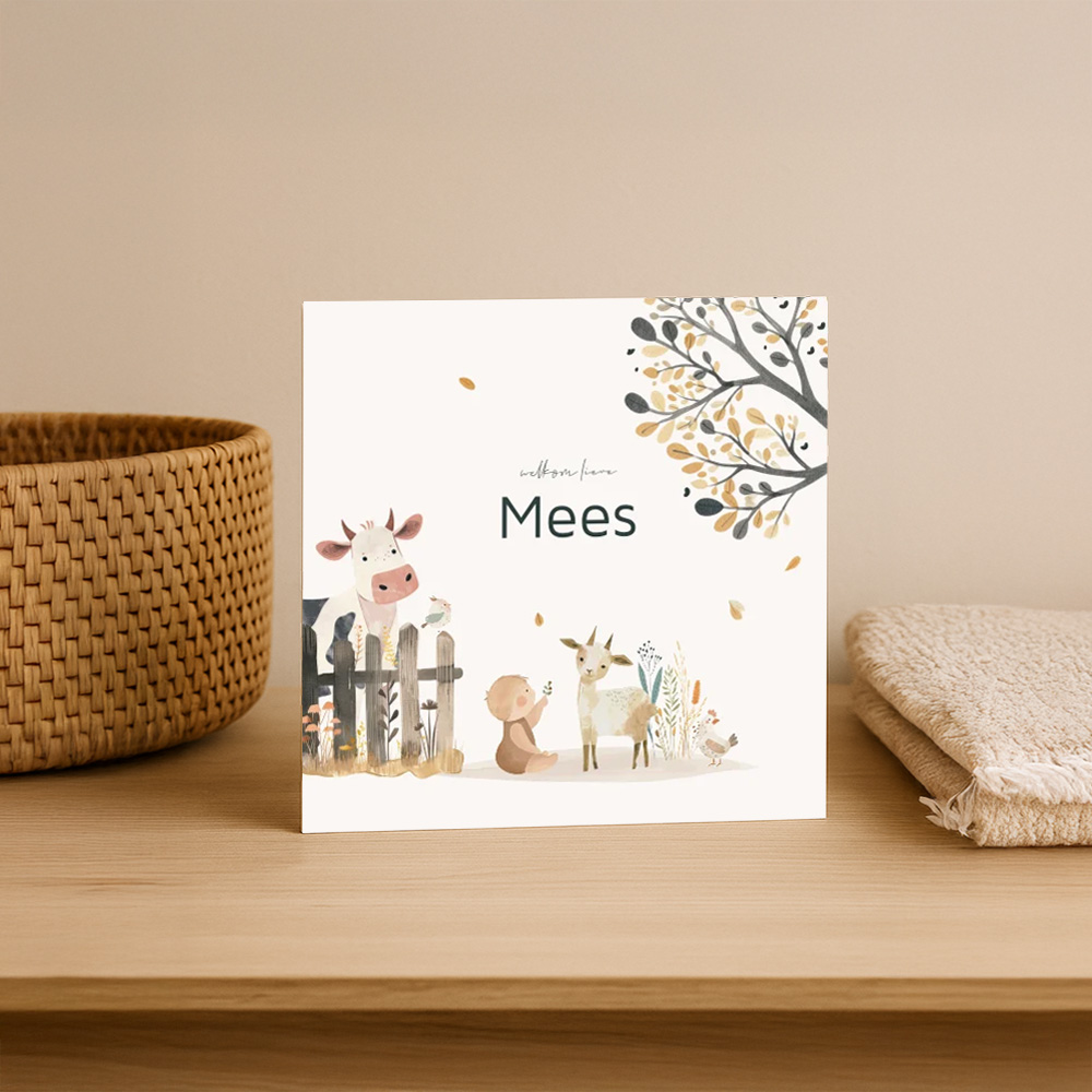Prachtig herfst geboortekaartje met een aquarel illustratie van een schattige baby met boerderijdieren zoals een koe, geit en kip. Op de achtergrond zie je een boom waarvan de bladeren afvallen. De warme herfsttinten en de zachte, getekende details geven een lieflijke en natuurlijke uitstraling aan dit unieke kaartje Mees. Pas de teksten, lettertypes en kleuren eenvoudig aan in de editor. Hulp nodig bij het ontwerpen? Neem contact met ons op!