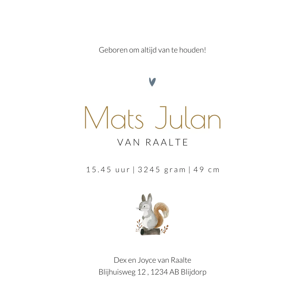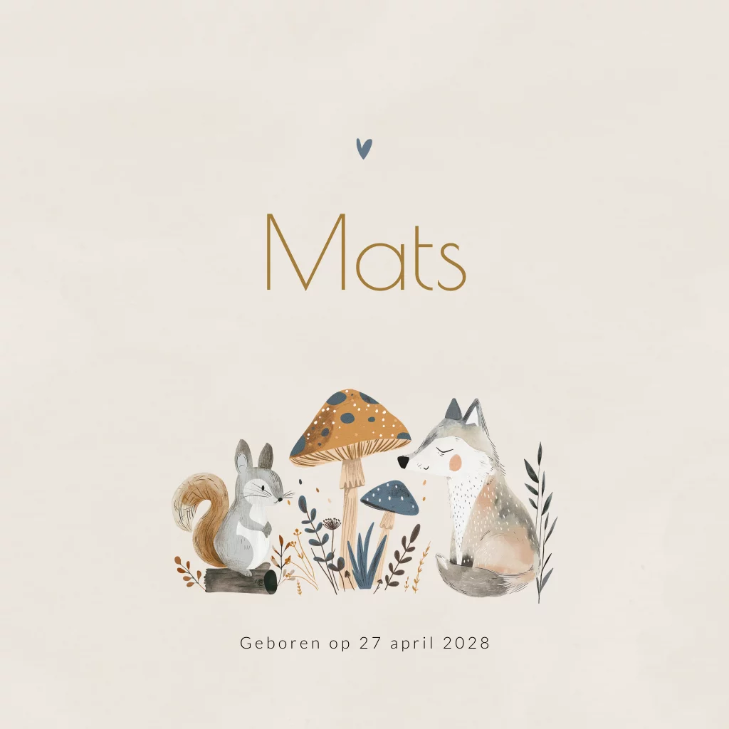 Geboortekaartje voor een jongen met een wolf en eekhoorn in het bos. De zachte aquarel tinten en leuke bosdieren geven dit kaartje een natuurlijke en speelse uitstraling. Personaliseer dit geboortekaartje Mats met jullie eigen gegevens en kies voor een bijpassende denim envelop en sluitzegel om het geheel compleet te maken.