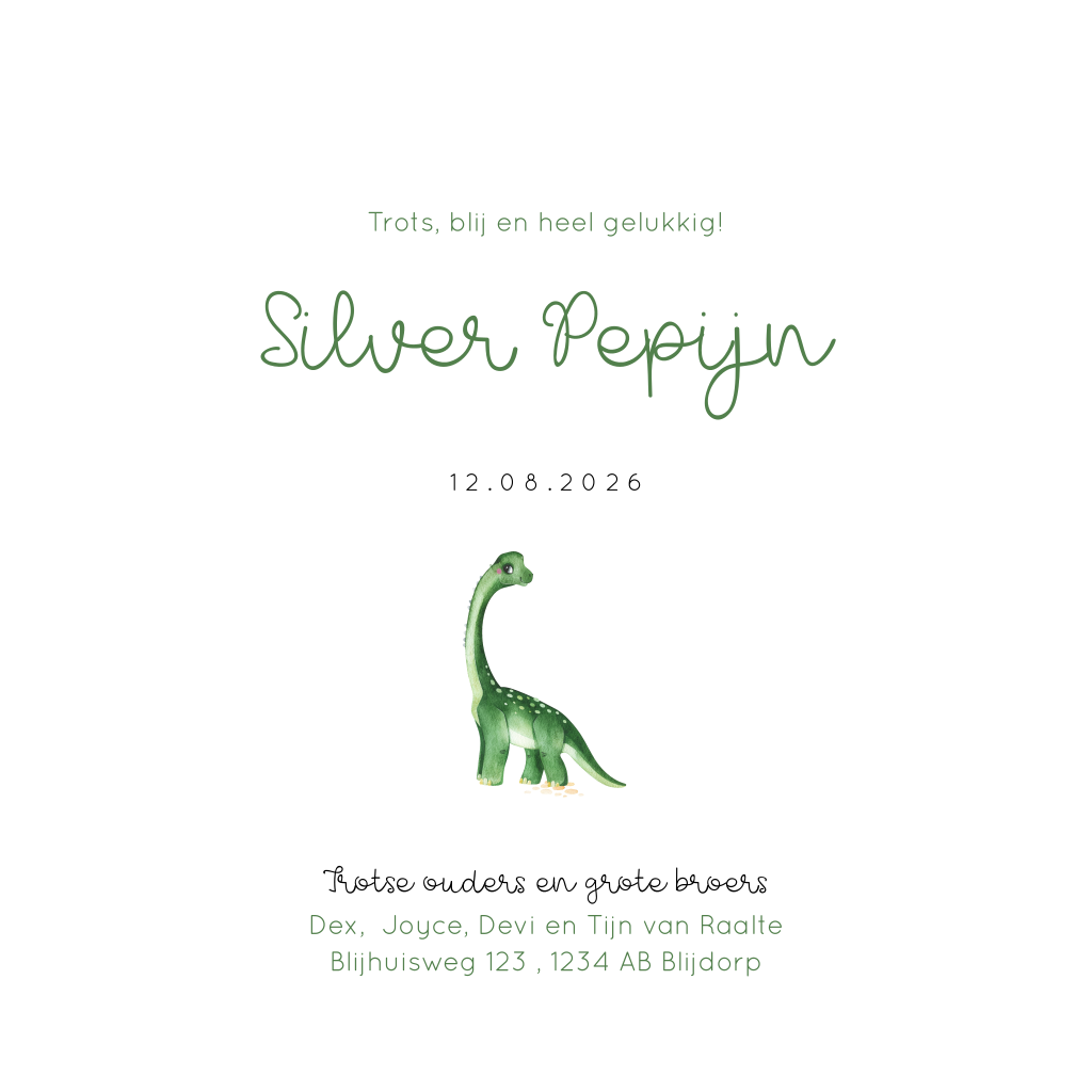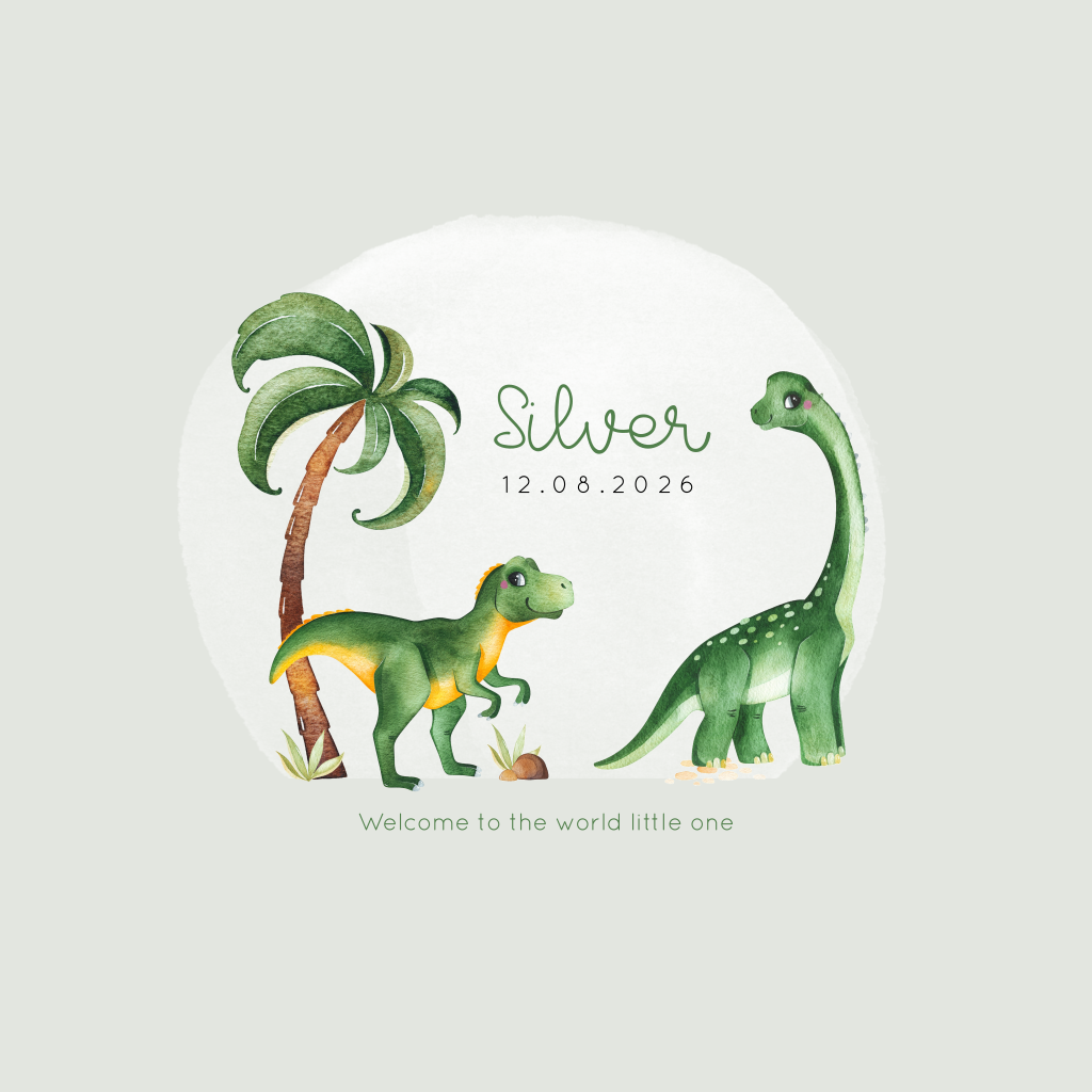 Trendy geboortekaartje voor een jongen, jullie zoon! Op dit jongenskaartje Silver zie je twee lieve aquarel dinosaurussen met een palmboom. Teksten en kleuren kun je eenvoudig aanpassen in de editor. Dit geboortekaartje is ook mogelijk voor een andere gezinssamenstelling.