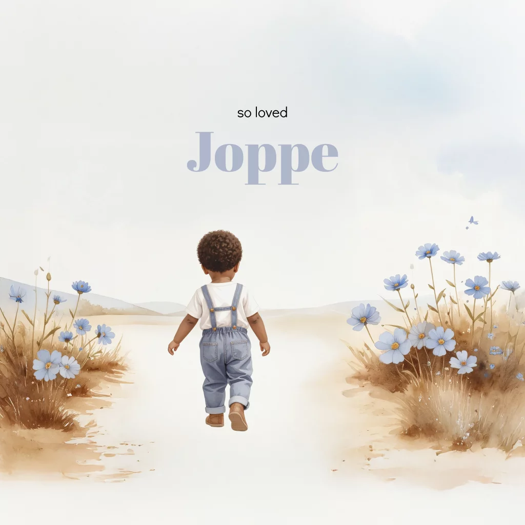 Geboortekaartje voor een jongen met aquarel tekening van een strand met bloemen waar het jongetje tussen loopt. Pas de teksten, lettertypes en kleuren van dit geboortekaartje Joppe eenvoudig aan in de editor.