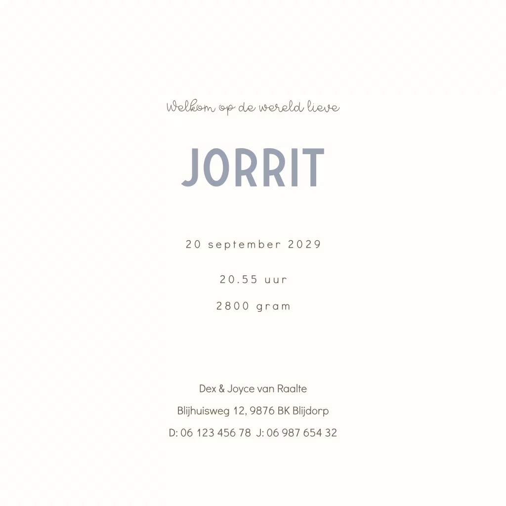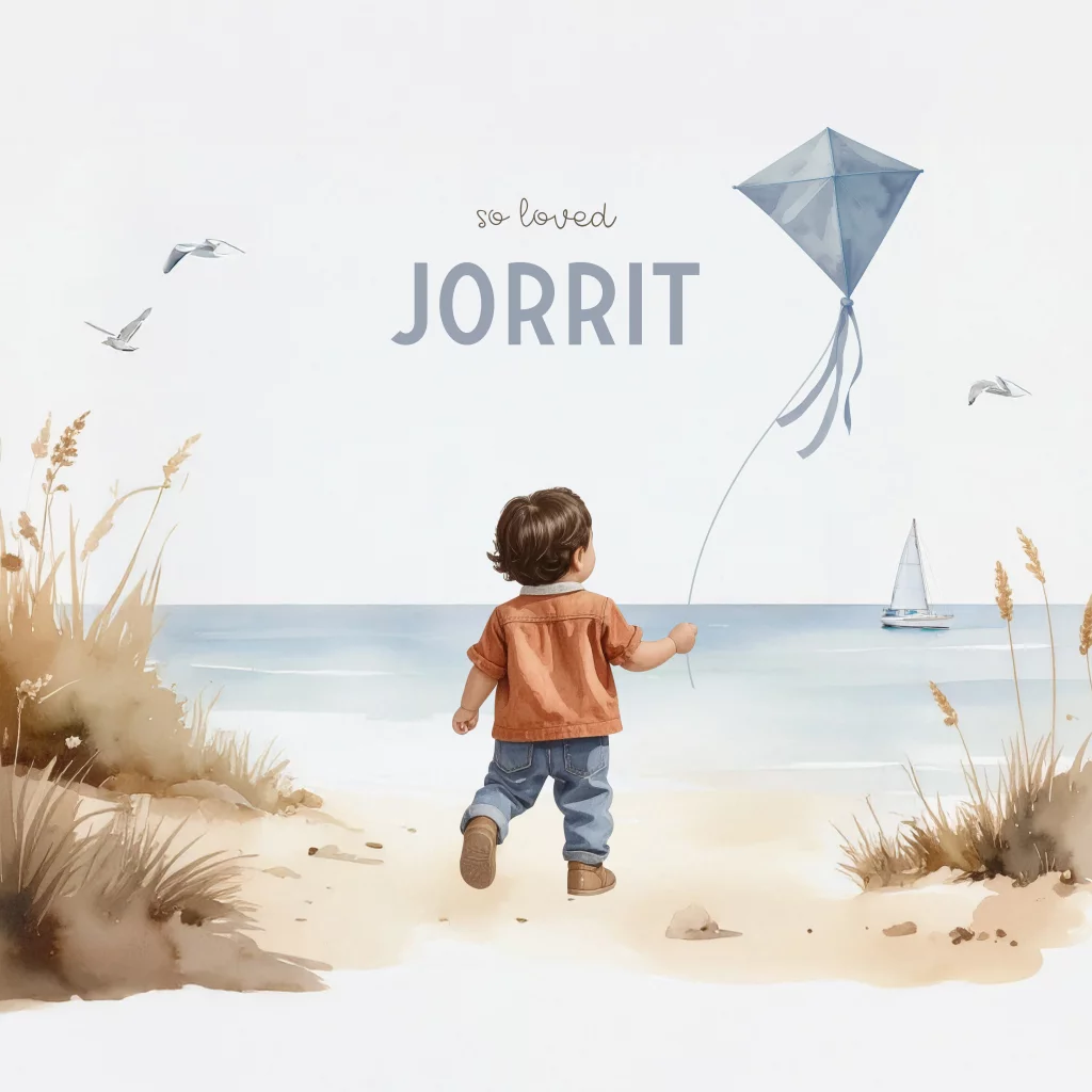 Hoera, jullie zoon is geboren! Daar past dit prachtige geboortekaartje Jorrit goed bij. Op dit geboortekaartje voor een jongen zie je een aquarel tekening van een jongetje op het strand met op de achtergrond de zee. Het jongetje is aan heet vliegeren. Pas de lettertypes en kleuren naar je eigen smaak aan de editor. Hulp nodig? Laat het ons weten!