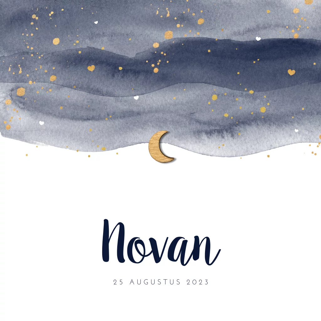 Dit kaartje is voorzien van een écht houten maantje. Houten vormpjes worden niet standaard meegeleverd, maar zijn bij te bestellen. Het houten vormpje op dit kaartje dient als voorbeeld en wordt niet gedrukt! Op die plek kun je straks zelf het échte houten vormpje plakken.