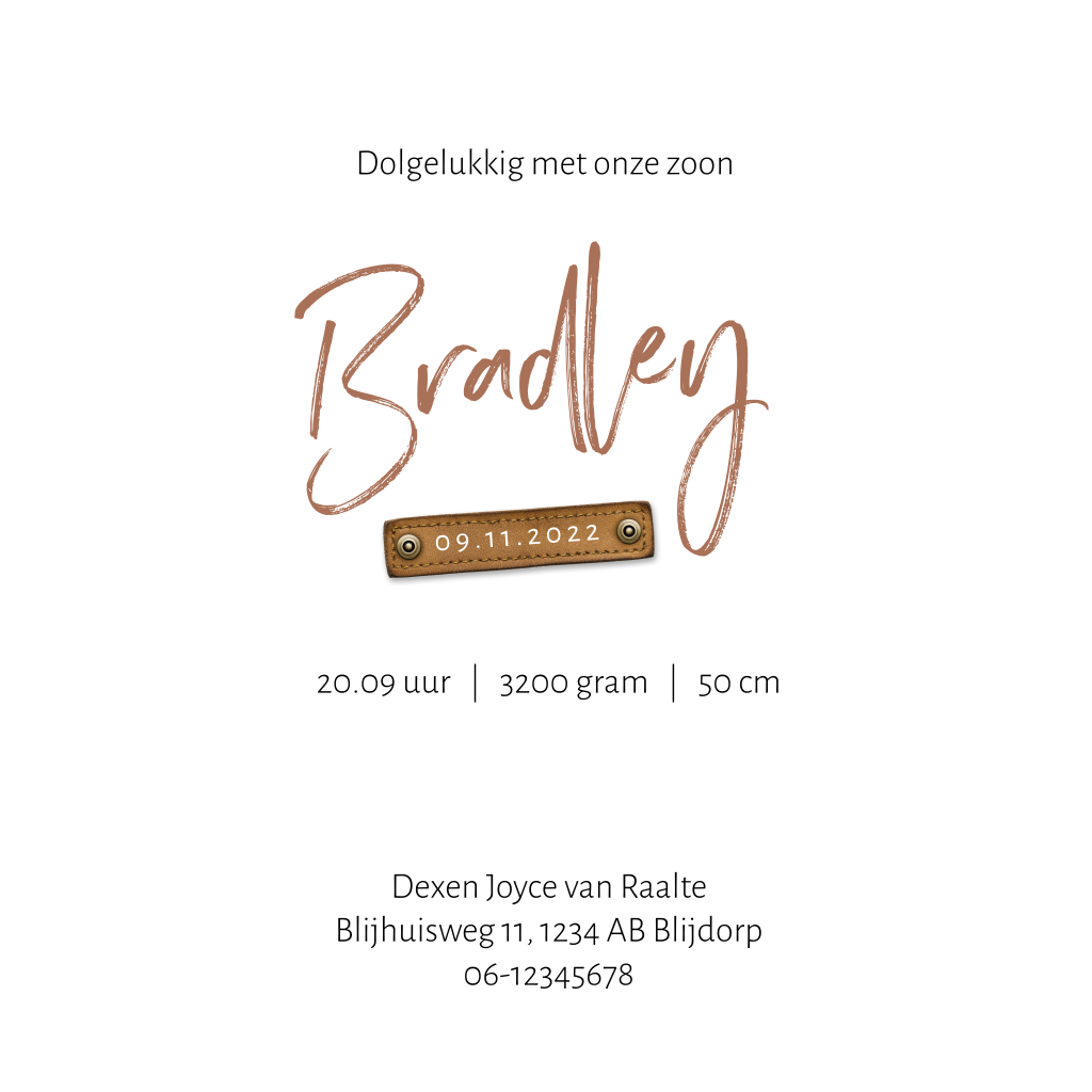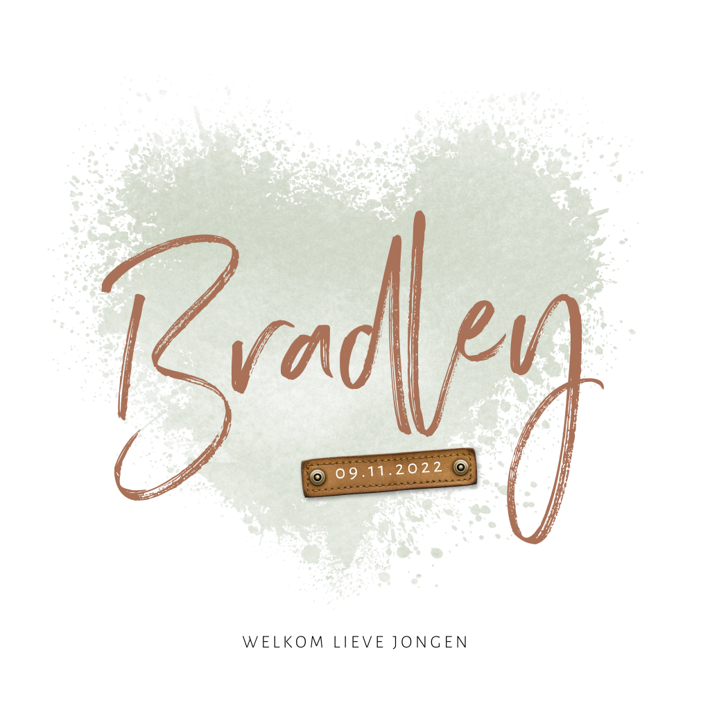 Hip geboortekaartje voor een jongen. Dit babykaartje Bradley heeft een aquarel achtergrond in de vorm van een groot hart. De kleurencombinatie olijfgroen met bronskleur en het leren labeltje geven de kaart een stoere look.