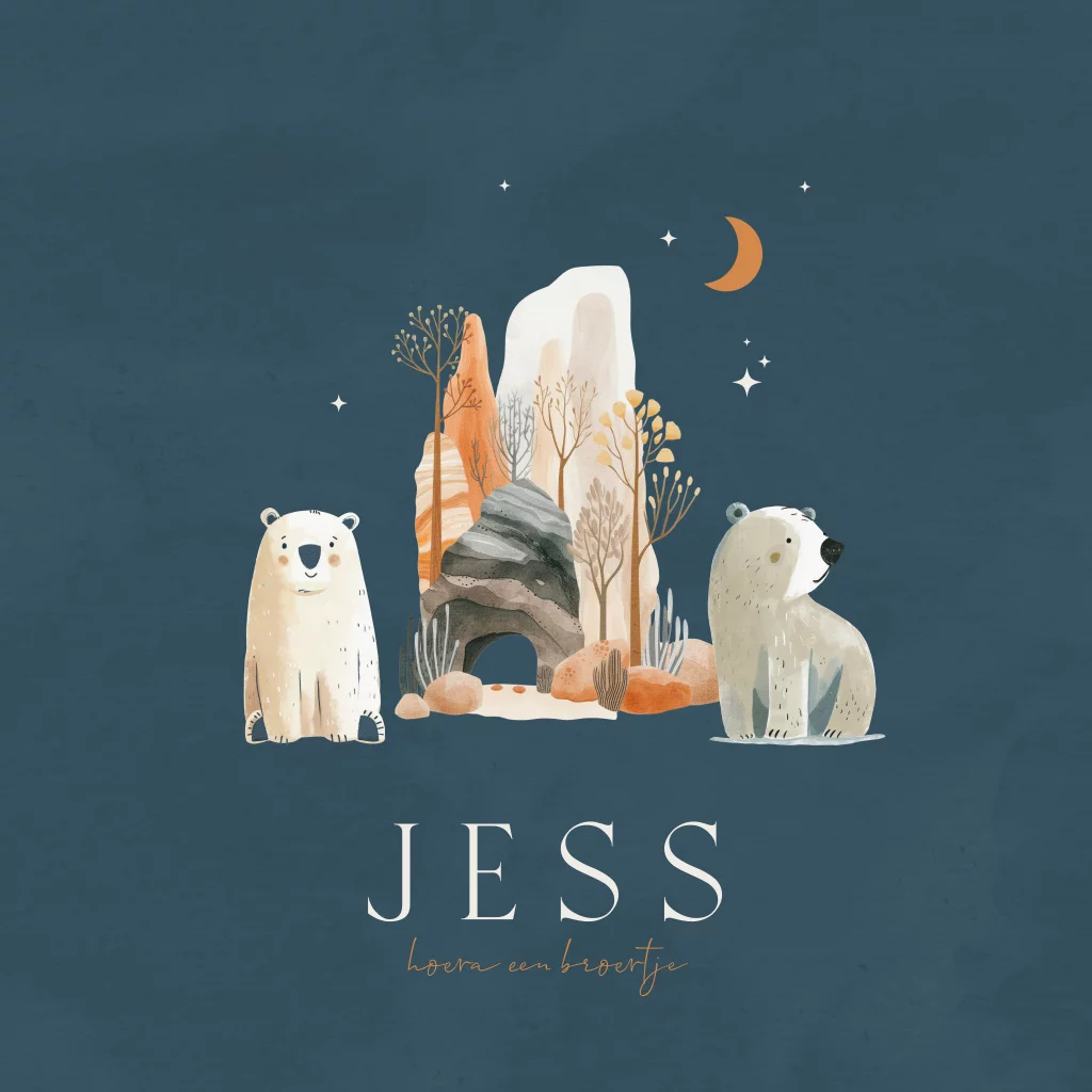 Dit prachtige geboortekaartje met een aquarel ontwerp van twee schattige ijsberen is een unieke manier om de komst van jullie tweede kindje, een broertje, aan te kondigen. De toevoeging van de maan en sterren op de achtergrond zorgt voor een sfeervol effect. De combinatie van de blauwe tinten en het illustratieve design maken dit geboortekaartje Jess perfect voor een winter baby.