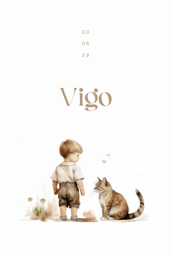 Een lief geboortekaartje voor een jongen! Op dit kaartje Vigo zie je een illustratie van een klein jongetje die naast een kat staat. Het jongetje en de kat kijken naar elkaar. Boven de kat zie je twee hartjes en naast het jongetje zie je een paar bloemetjes. Dit rustige, prachtige geboortekaartje is zeker een geschikte keuze om de geboorte van jullie zoon aan te kondigen. Pas het kaartje naar eigen smaak aan in onze online editor en verspreid jullie vreugdevolle nieuws met dit prachtige geboortekaartje.