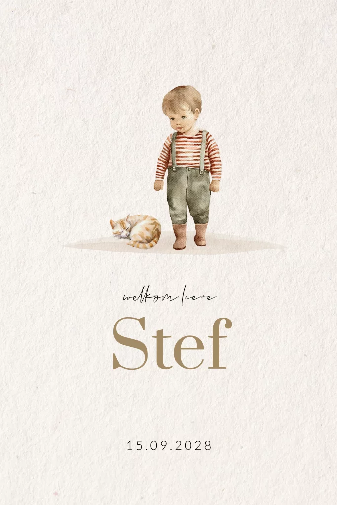 Lief geboortekaartje voor een jongen. Op dit geboortekaartje Stef zie je een schattige illustratie van een een jongetje samen met zijn kat. De oude papierenlook achtergrond en afgeronde hoeken maken van dit rustige geboortekaartje een prachtig ontwerp. Pas dit geboortekaartje naar eigen wens aan in onze online editor en maak het kaartje voor jullie zoon helemaal af met de bijpassende donkergroene envelop.