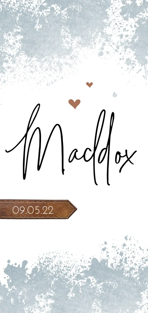 Lief stoer geboortekaartje voor een zoon. Op dit babykaartje Maddox staat de naam in sierlijke letters. De datum staat in een leren label