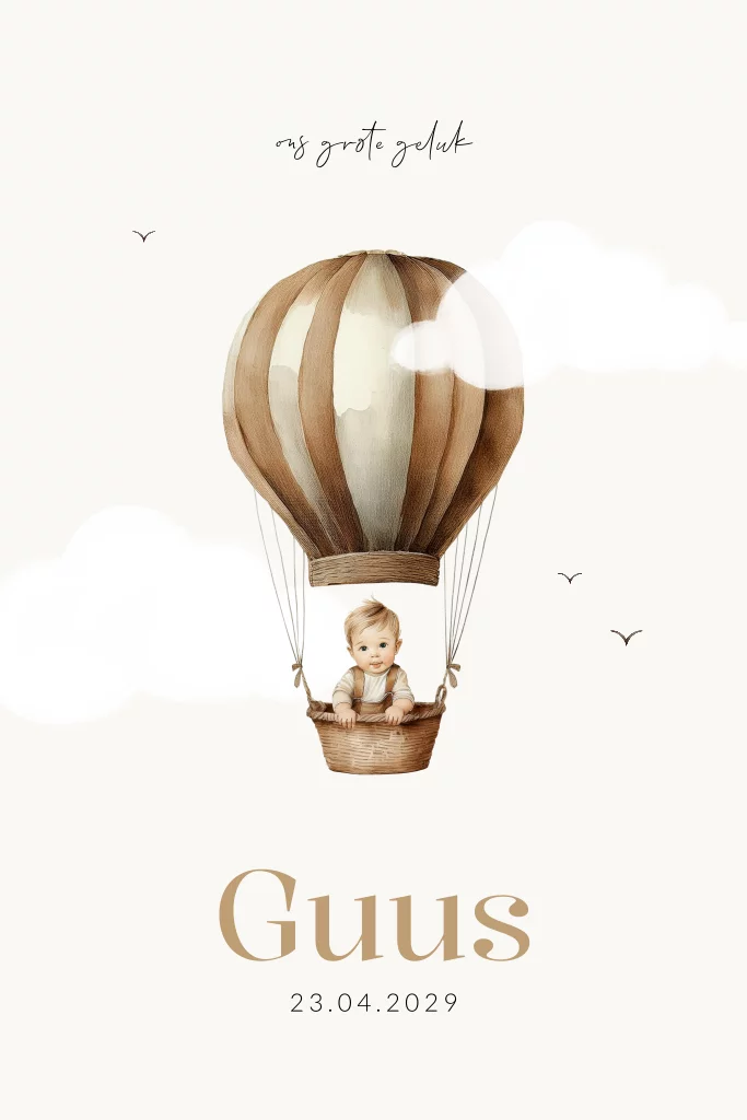 Een prachtig luchtballon geboortekaartje voor een jongen. Dit geboortekaartje Guus heeft een mooi design van een jongetje in een luchtballon mandje met daarboven de tekst ´ons grote geluk´. De luchtballon zweeft in de lucht tussen de wolken en vogeltjes. Dit geboortekaartje heeft speelse afgeronde hoeken en een rustig design qua kleurtinten. Het gehele geboortekaartje is naar eigen wens aan te passen in onze online editor. Maak dit kaartje voor jullie zoon helemaal af met de bijpassende sluitzegel en de envelopkleur zand.