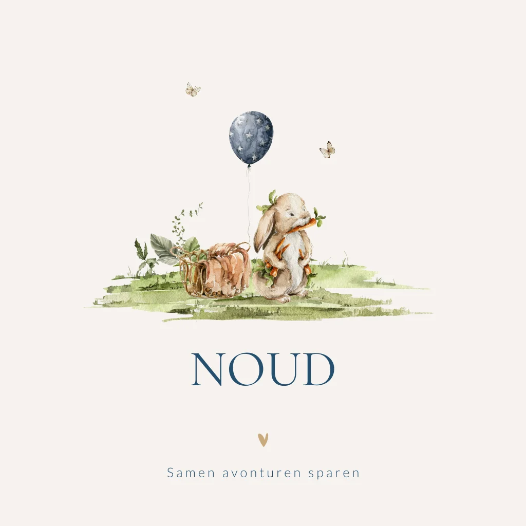 Dit prachtige geboortekaartje met aquarel tekening van een schattig konijntje is perfect als geboortekaartje voor een jongen. Op het kaartje zie je een schattig konijntje wortels eten met daaromheen een mand gevuld met een dekentje. Aan het mandje is een blauwe ballon bevestigd met twee fladderende vlinders erbij. Pas dit geboortekaartje Noud eenvoudig aan in de online editor.