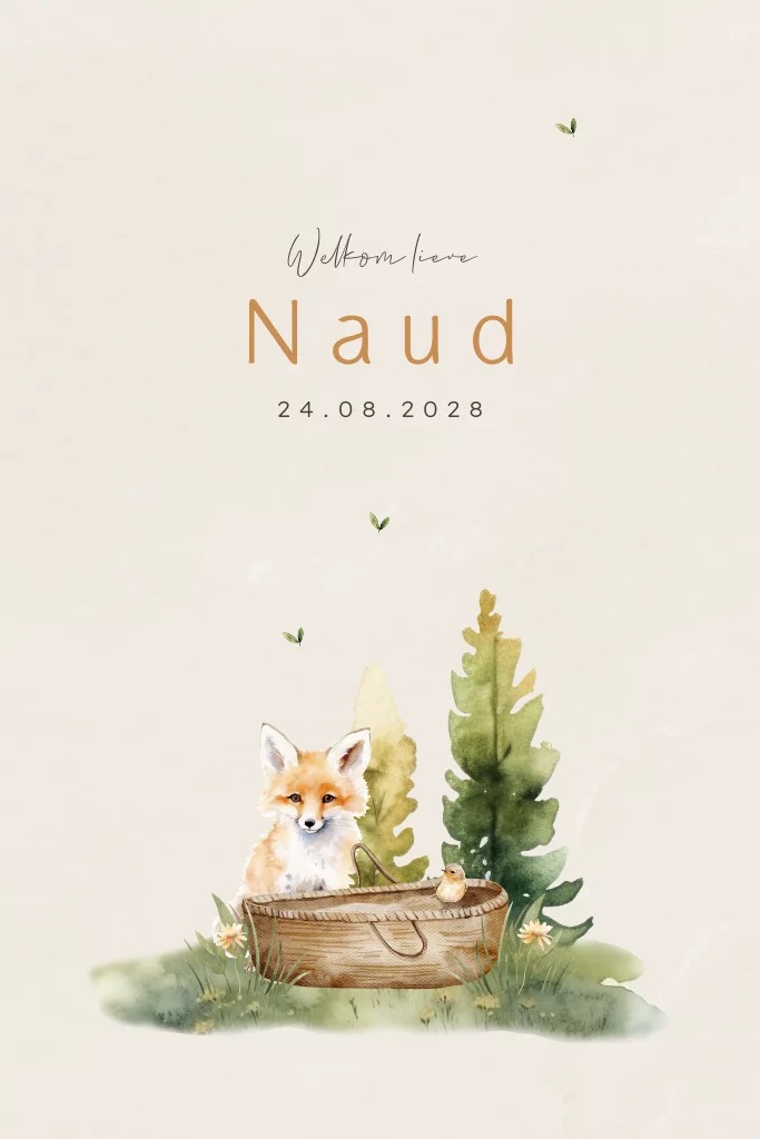 Geboortekaartje voor een jongen met een aquarel illustratie van een vosje in het bos, zitten bij een mand van een baby. De warme tinten geven het kaartje een liefdevolle en natuurlijke uitstraling. Pas dit geboortekaartje Naud geheel naar eigen wens aan in de editor en combineer met een mooie envelop en sluitzegel om het helemaal af te maken.
