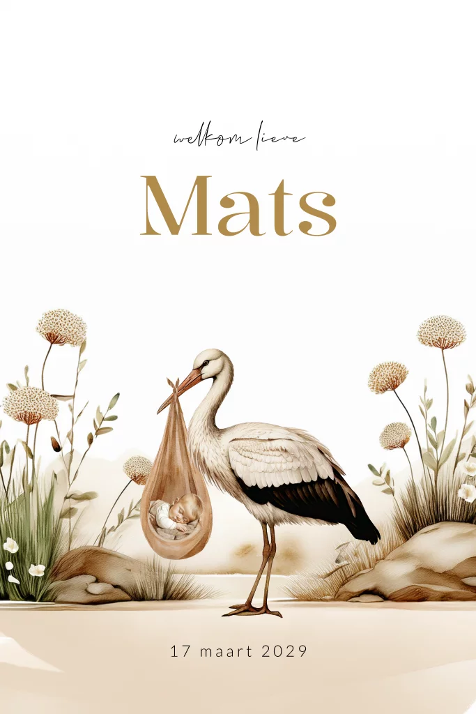 Lief geboortekaartje voor een jongen met een aquarel van een ooievaar. De ooievaar bezorgt een baby jongetje die hij in een zak heeft. Op de achtergrond een aquarel van bloemen. De afgeronde hoeken geven dit kaartje Mats een speels effect. Maak het geheel af met een bijpassende sluitzegel en envelop.