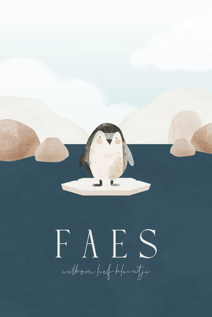 Geboortekaartje voor een jongen met een pinguïn op een ijsschots. Dit geboortekaartje Faes is perfect voor ouders die een kindje in de winter verwachten! Pas de kleuren, teksten en lettertypes eenvoudig in de editor. Hulp nodig? Wij helpen je graag!