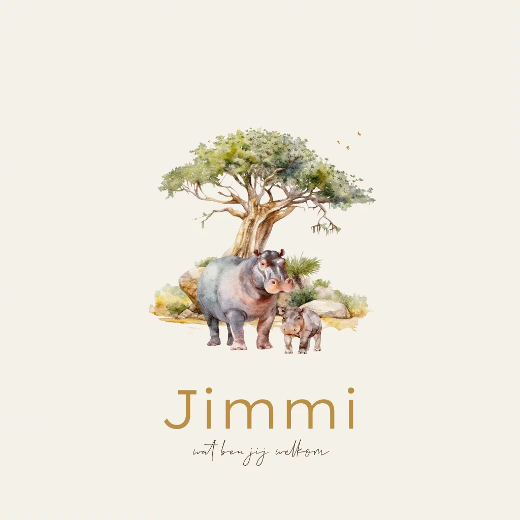 Safari geboortekaartje voor een jongen met nijlpaarden en bomen. Pas dit geboortekaartje Jimmi eenvoudig aan in de editor. Combineer met een mooie envelop en sluitzegel om het geheel helemaal af te maken.