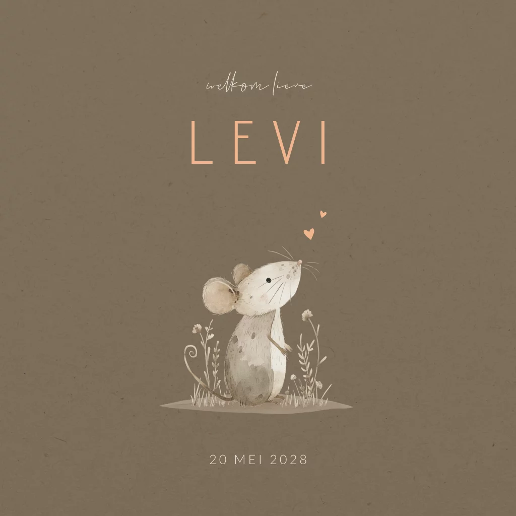 Dit schattige geboortekaartje voor een jongen is voorzien van een lieflijk aquarel ontwerp van een schattige muis. De zachte kleuren en illustratieve stijl geven een warme en knusse uitstraling aan dit kaartje Levi. Perfect voor de aankondiging van de geboorte van jullie zoon. Bestel vandaag nog en maak de geboorte van jullie kindje onvergetelijk.