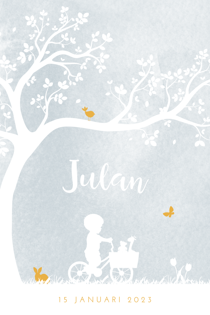Hip silhouet geboortekaartje voor een zoon. Op dit kaartje Julan met aquarel achtergrond, staat het silhouet van een jongen op de fiets. Verder op dit kaartje een boom, konijntje, vlindertje en in het bakje van de fiets 2 knuffeltjes. De teksten en kleuren, evenals het silhouet, zijn aan te passen in de editor.