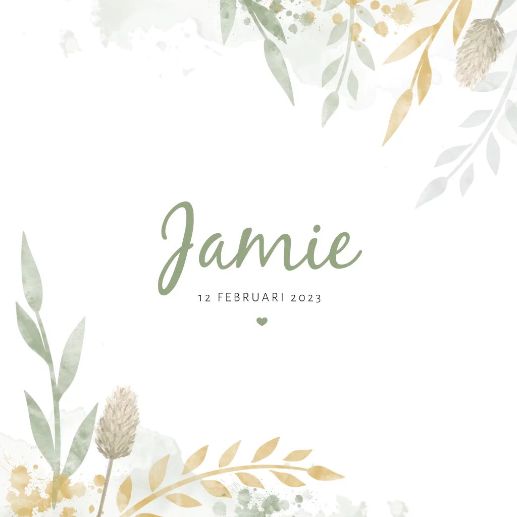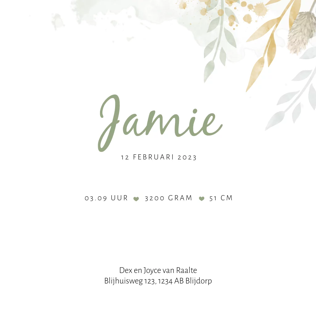 Trendy geboortekaartje Jamie voor een zoon met geschilderde takjes en aquarel. Deze kaart kun je zelf bewerken in de editor, zo kun je de kleuren, lettertypes en teksten naar je eigen wens aanpassen.