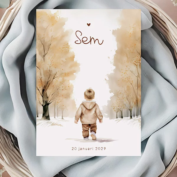 Een schitterend geïllustreerd geboortekaartje in winterthema voor een jongen. Op dit kaartje Sem zie je een schattig jongetje in een winters aquarel landschap lopen. Dit geboortekaartje valt onder de collectie retro childhood. Pas dit winterse kaartje voor jullie zoon naar eigen wens aan in onze online editor en maak het geheel af met de olijfgroene envelop. Hulp nodig? Ons team helpt je graag!
