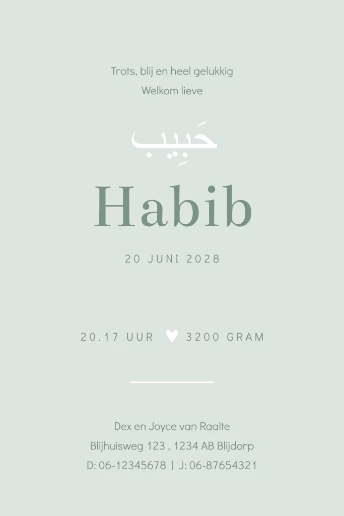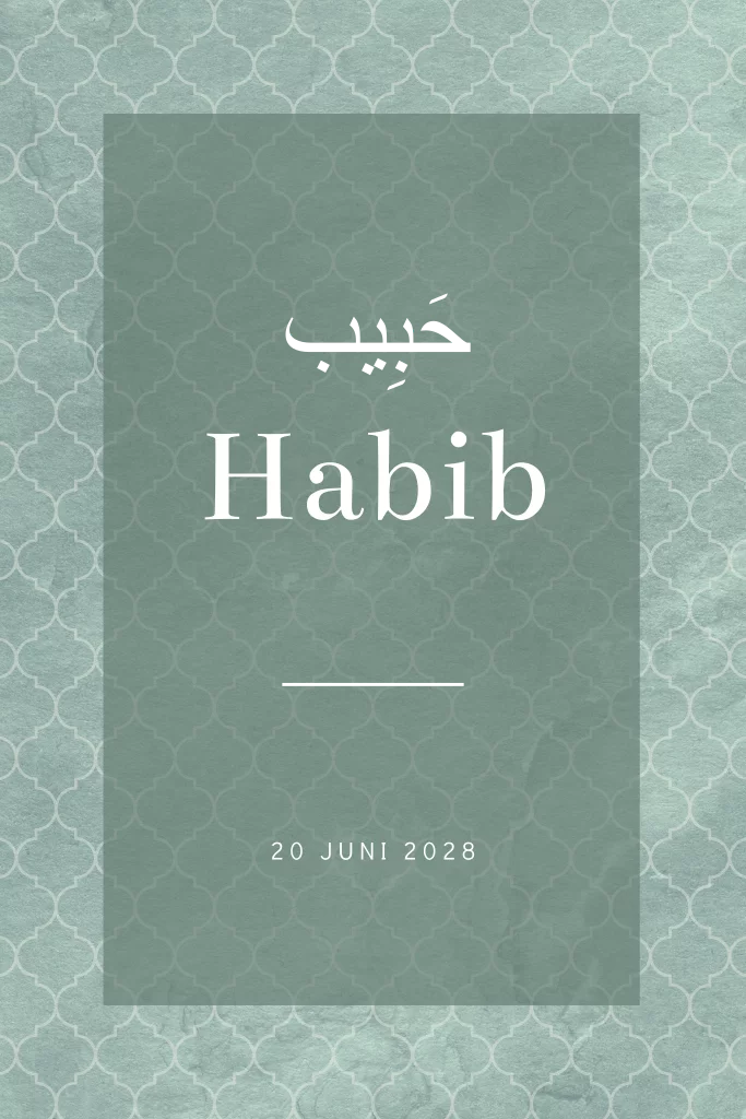 Een stoer Arabisch geboortekaartje voor een jongen! Op dit kaartje zie je een tegel patroon en een kader met de Arabische naam en de babynaam. Verschillende elementen van dit geboortekaartje zijn in goudfolie vormgegeven zowel aan de buitenzijde als aan de binnenzijde. Foliedruk geeft een extra luxe uitstraling aan het kaartje. Pas dit islamitische geboortekaartje naar eigen wens aan in de online editor voor jullie zoon.