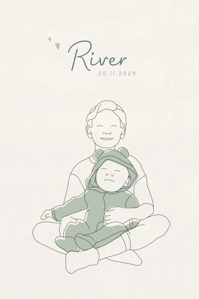 Op zoek naar een uniek geboortekaartje voor een tweede kindje, jullie zoon? Bekijk dan eens dit hippe geboortekaartje River met lijntekening van een grote broer met zijn broertje op schoot. De linnenlook achtergrond, neutrale kleuren en ronde hoeken zijn helemaal volgens de trend van nu. Je kunt het kaartje helemaal aanpassen naar je eigen smaak in de online editor. Hulp nodig? Bel, mail of chat gerust!