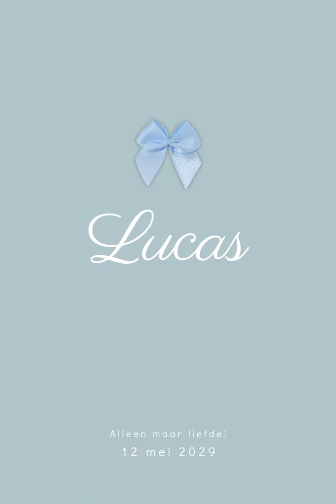 Een stijlvol geboortekaartje met een echte strik voor jullie zoon. Pas dit klassieke geboortekaartje Lucas met ronde hoeken naar eigen wens aan in onze online editor. Het blauwe echte strikje en de petrol envelopkleur maken deze kaart helemaal in stijl af. Dit geboortekaartje is geïnspireerd op het kaartje van Roos van der Aa. Hulp nodig? We helpen je graag!