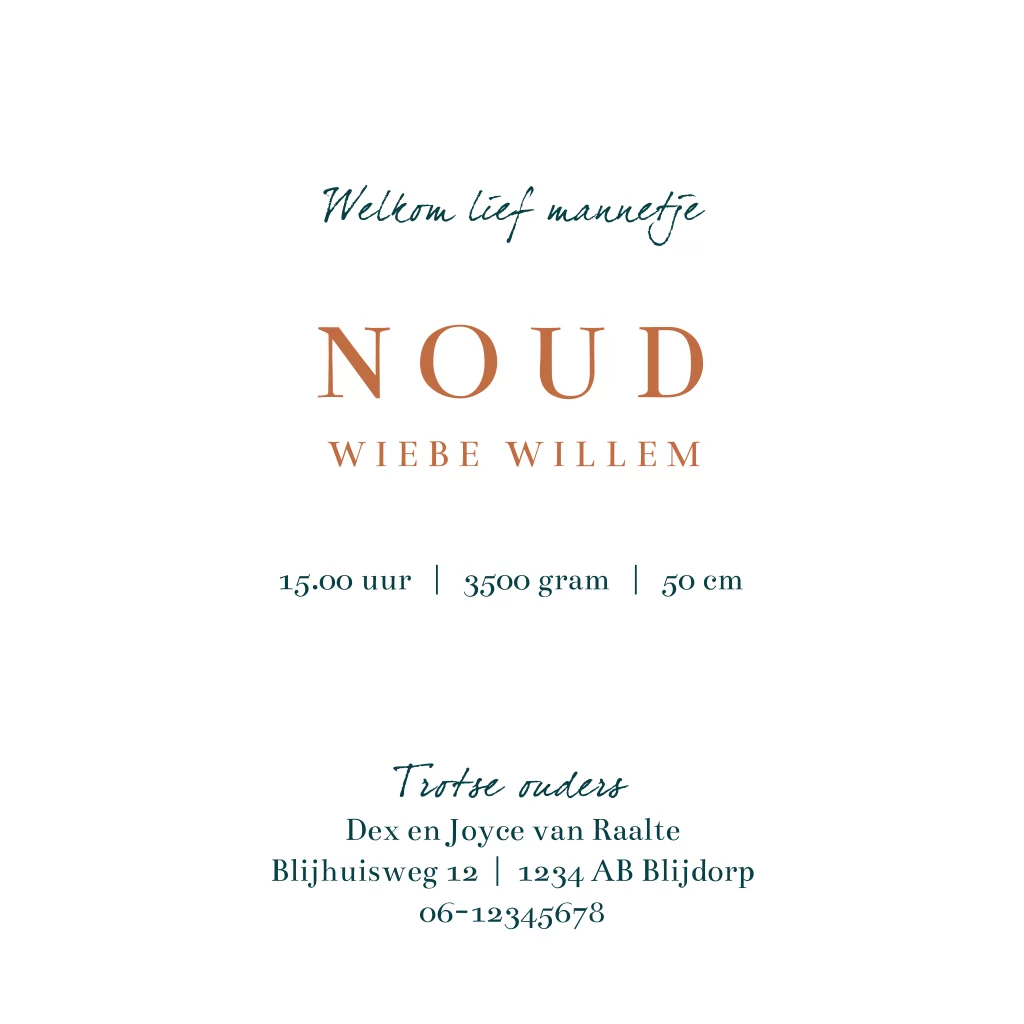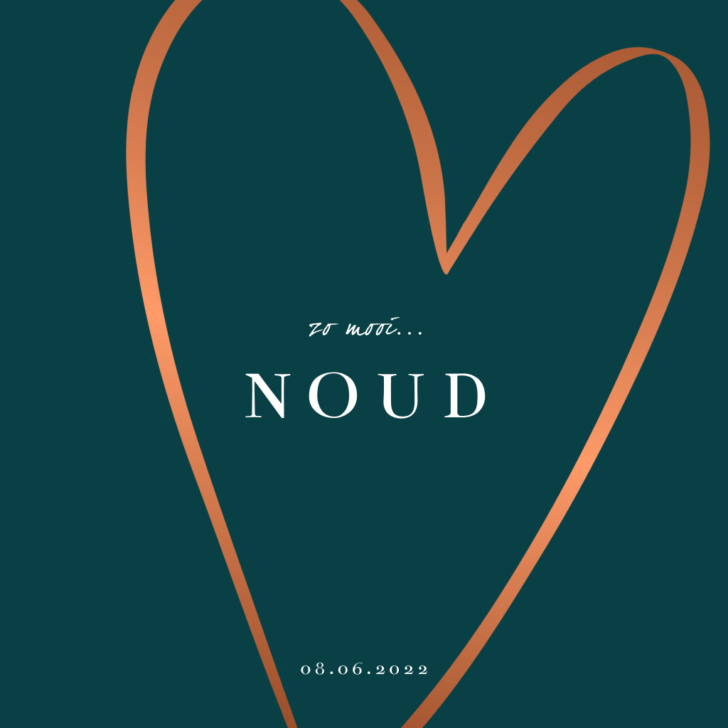 Basic maar stijlvol geboortekaartje voor een zoon in een hippe combinatie van donkergroen met koperkleur. Op dit babykaartje Noud staat een groot koperen hart op de achtergrond. Verder heeft deze kaart een rustige uitstraling en de kleuren zijn gemakkelijk aan te passen.