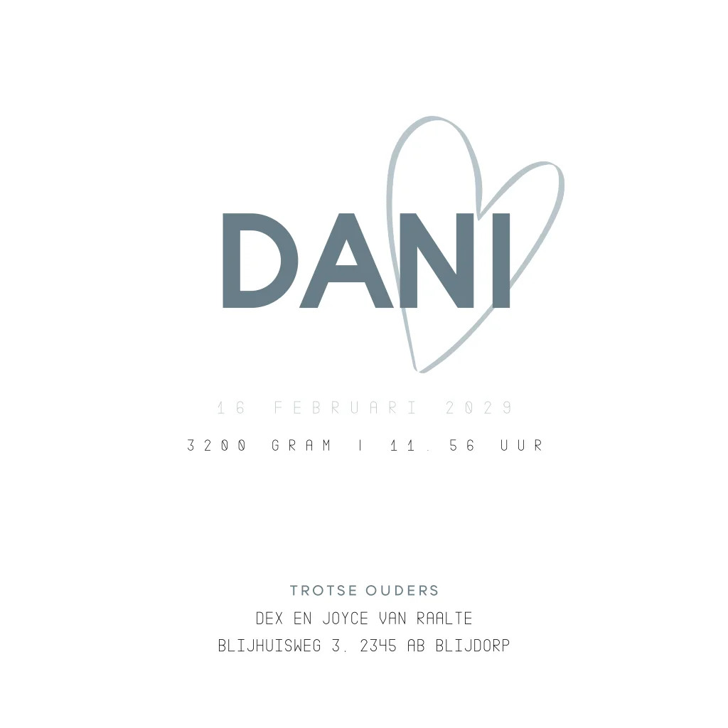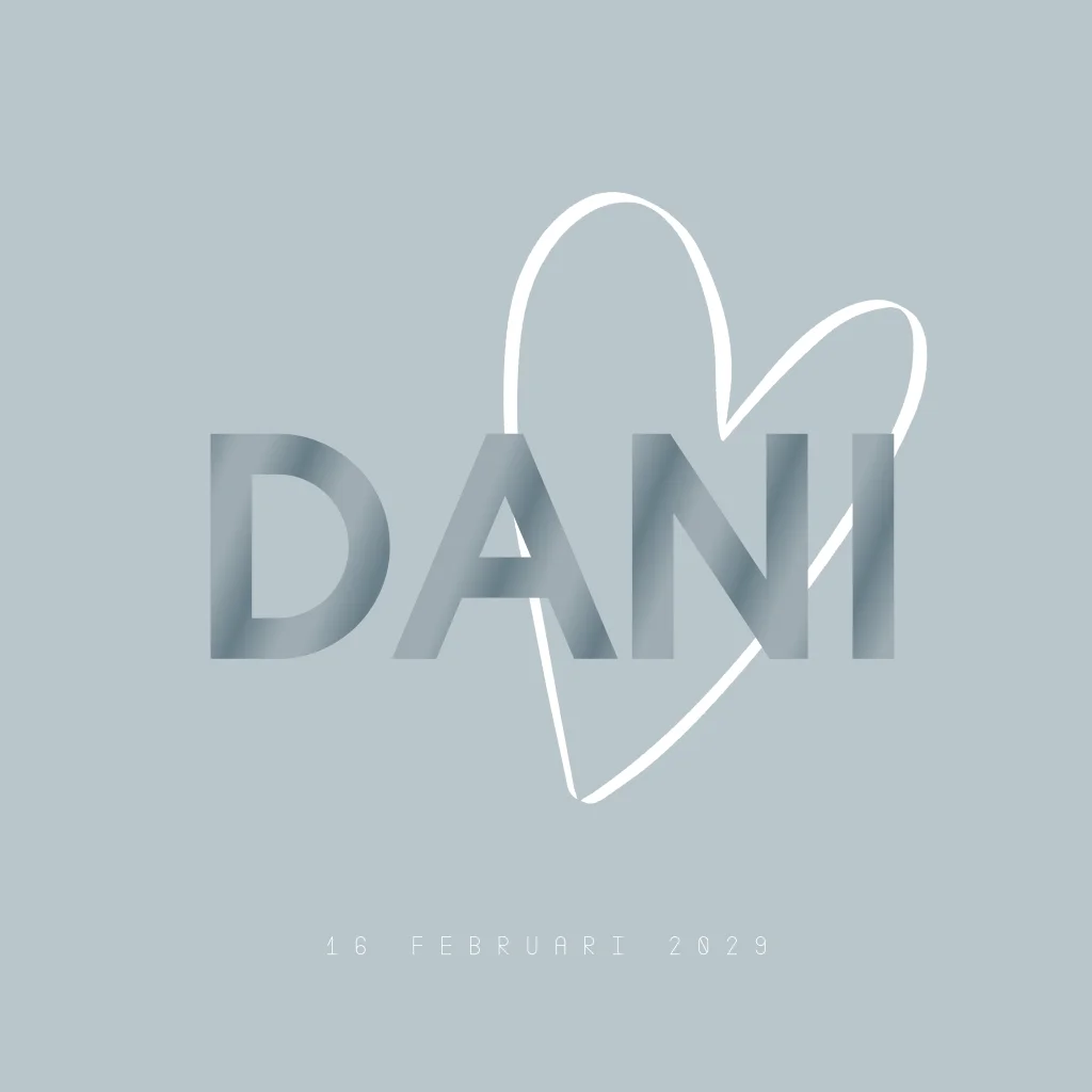 Dit is het perfecte geboortekaartje voor een jongen! Het kaartje heeft een rustige en eenvoudige uitstraling, met een mooie blauwe achtergrond met wit hartje. De naam van de baby staat in een stoer strak lettertype en is voorzien van spot-uv hoogglans. Hierdoor springt de naam van jullie zoon er extra uit! Pas dit geboortekaartje Dani geheel naar eigen wens aan in de editor.
