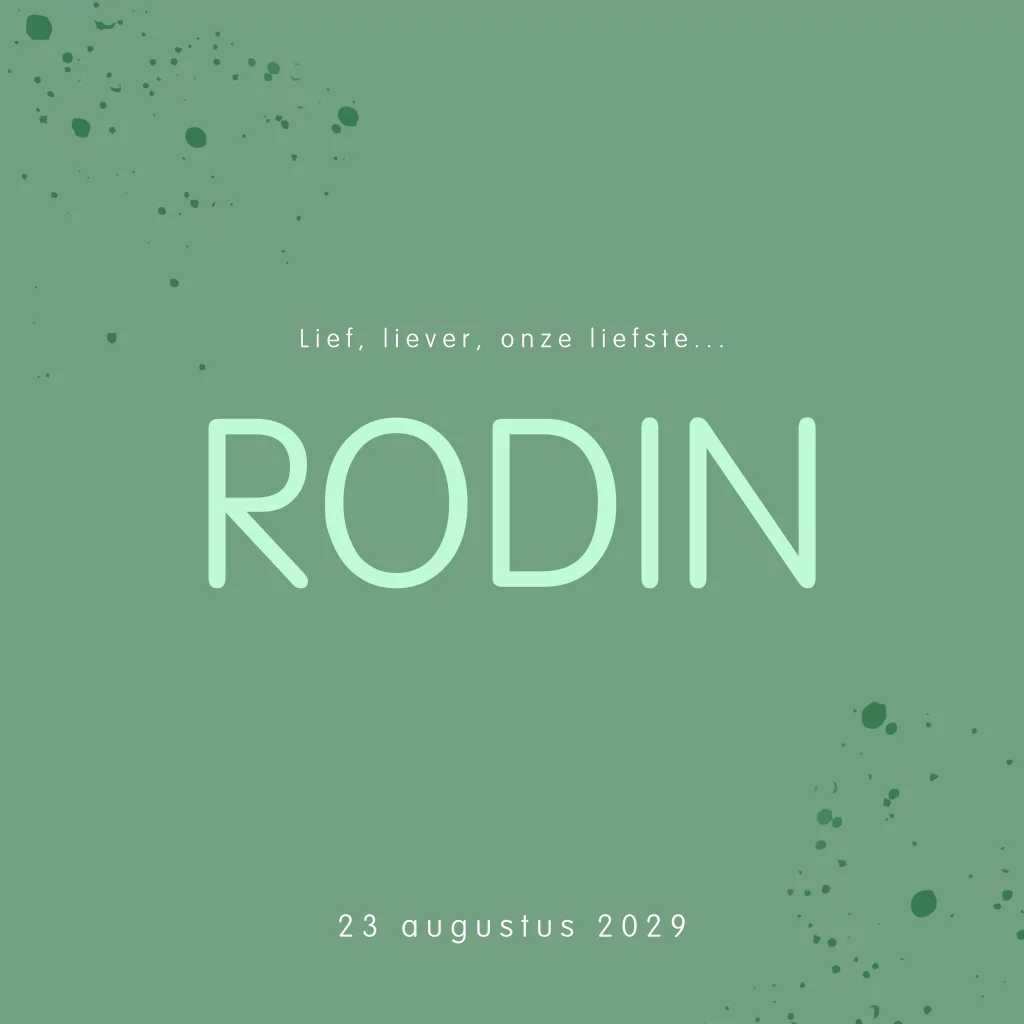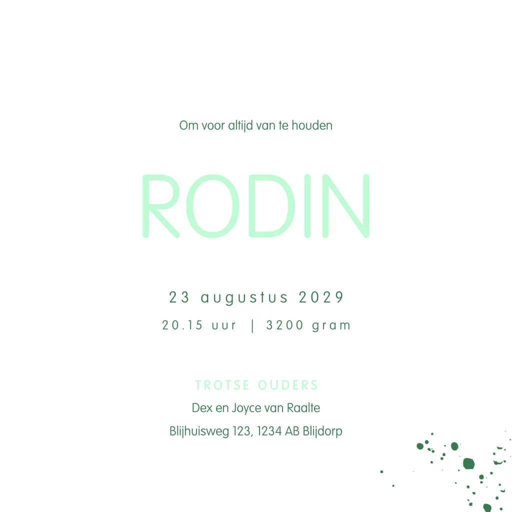 Hip en basic geboortekaartje voor een jongen met een mooie groene achtergrond en aquarel spetters. Op de binnenzijde van dit kaartje Rodin kun je een foto toevoegen van jullie zoon. Pas de teksten en lettertypes naar wens aan in de editor.
