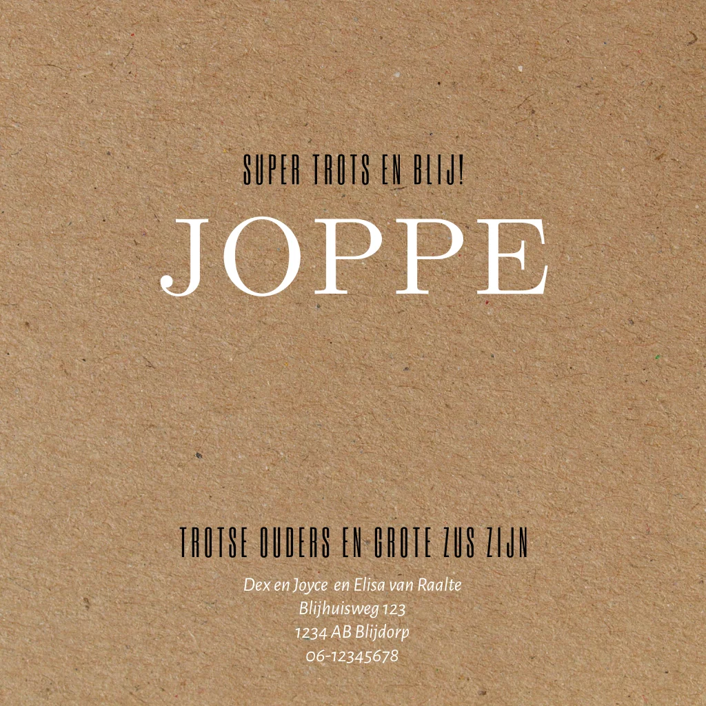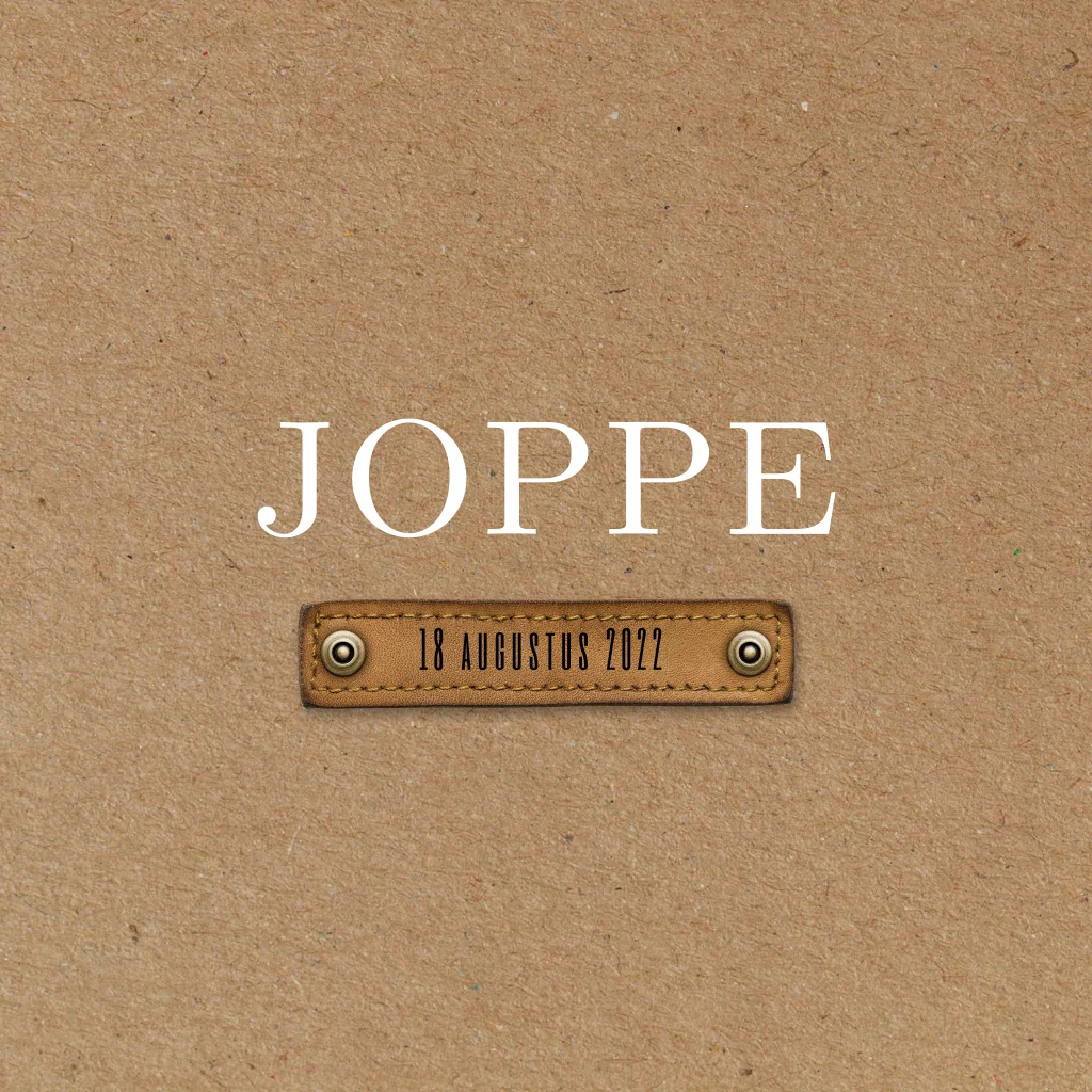 Een basic geboortekaartje voor een jongen op een kraft kartonnen achtergrond. Bij dit geboortekaartje Joppe is er gebruik gemaakt van een strak lettertype en een leren label.