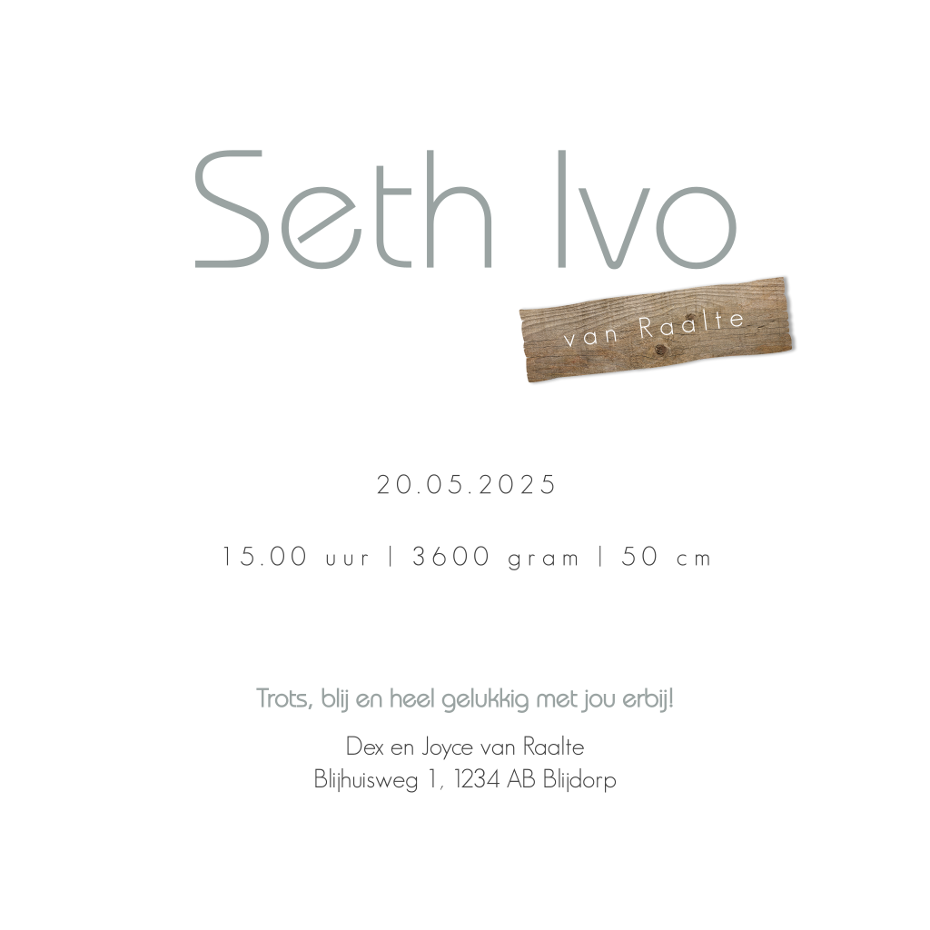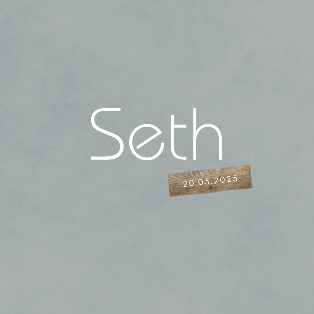 Basic geboortekaartje voor een jongen in de kleur grijsblauw. Onder de naam Seth staat een klein houten label waarop de geboortedatum van de baby staat. Teksten en kleuren zijn eenvoudig aan te passen in de editor.