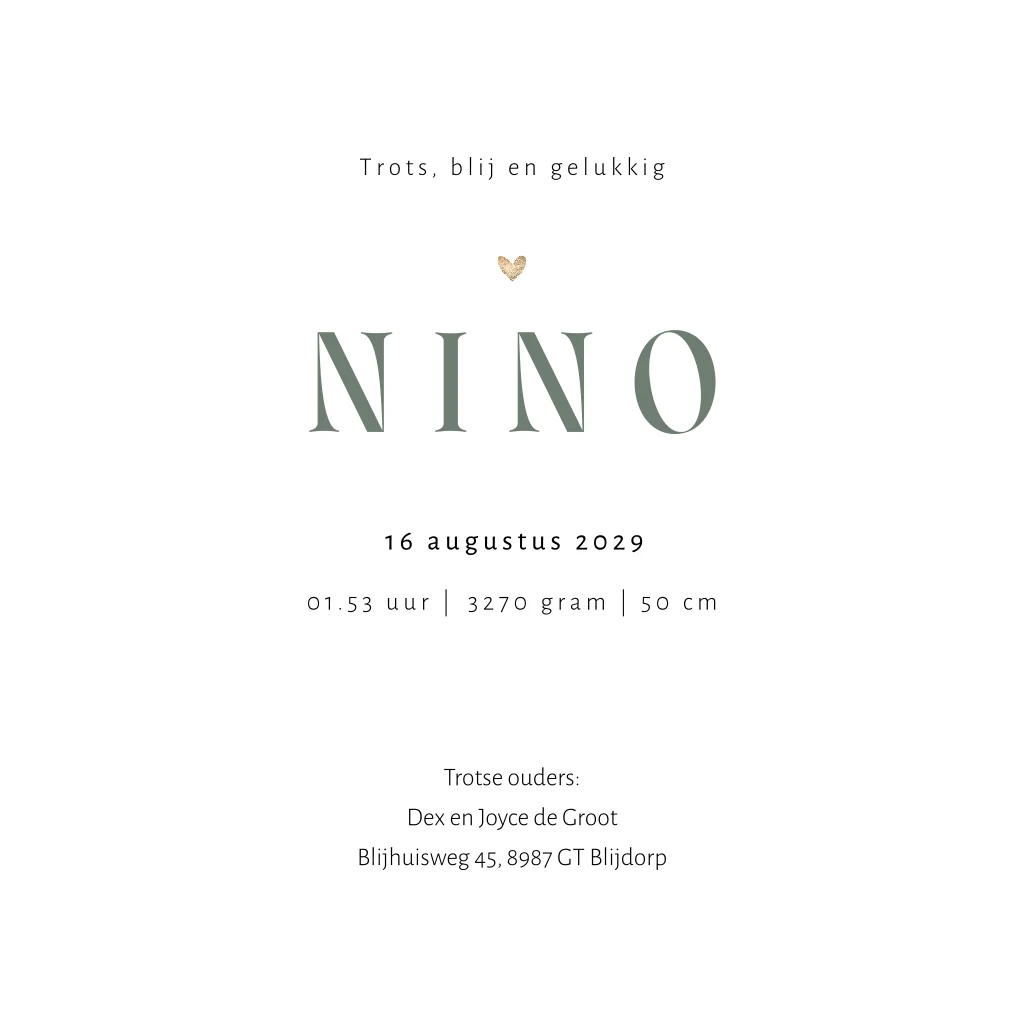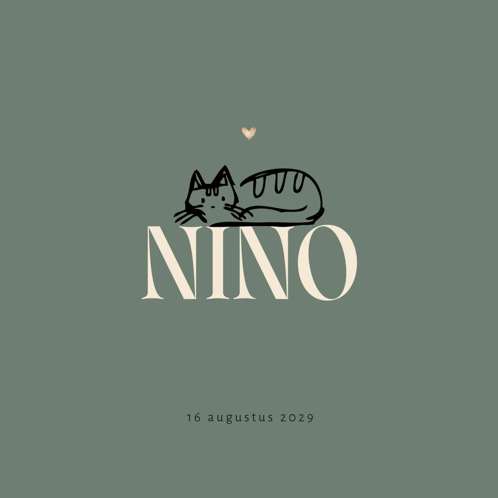 Rustig geboortekaartje voor een zoon. Op dit geboortekaartje voor een jongen een stoere hippe groene achtergrond met op de naam van jullie jongen een illustratie van een kat met gouden hartje. Dit geboortekaartje Nino heeft een rustig maar stoer design. Teksten, kleuren en lettertypes zijn aan te passen in de editor.