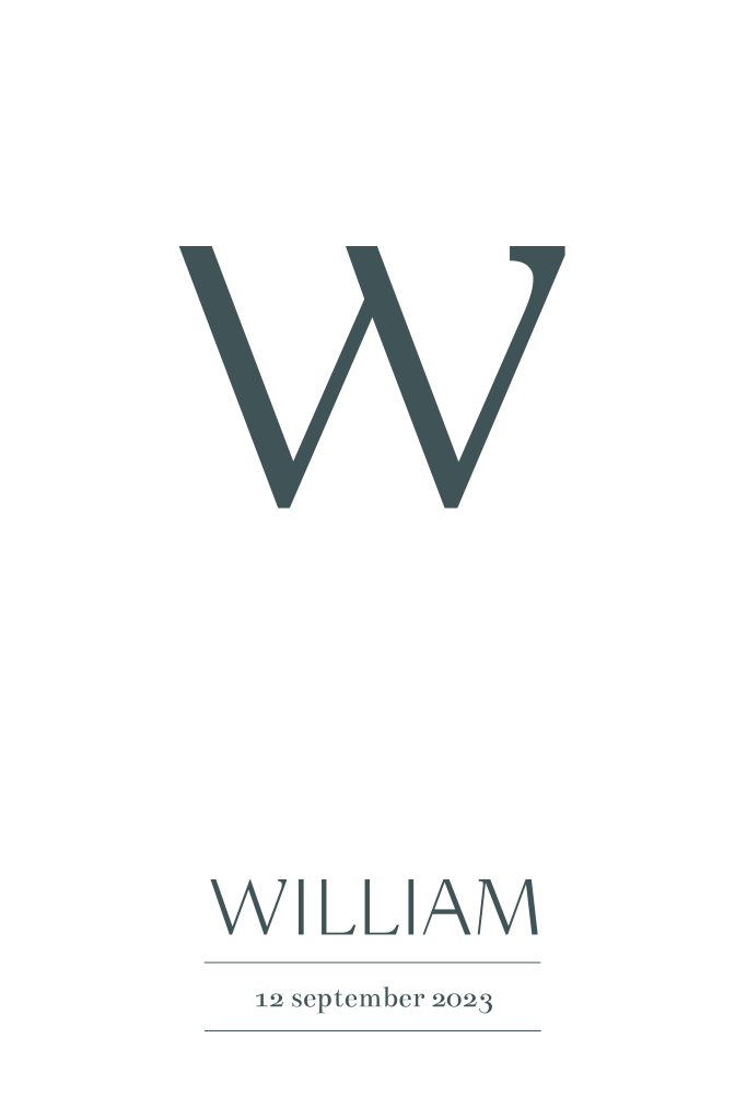 Basic geboortekaartje voor een zoon waarbij de eerste letter van de naam prominent op de kaart staat. Op de achterzijde van dit babykaartje William staat een sterretje. Liever andere kleuren? Deze kaart is gemakkelijk aan te passen in onze editor.