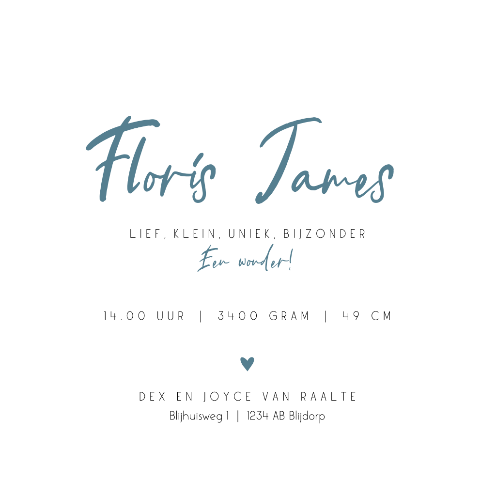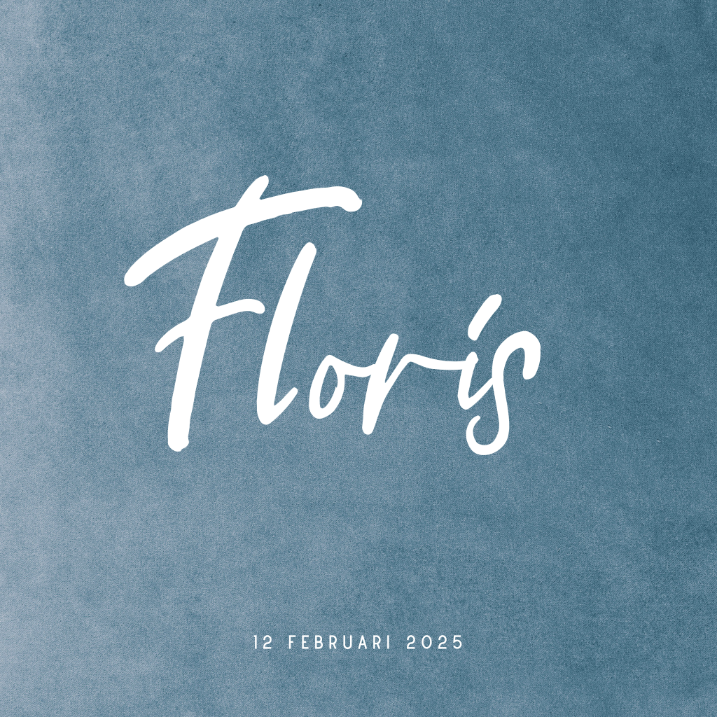 Een basic geboortekaartje voor een jongen, met de baby naam Floris groot op de voorkant. Deze trendy velvet achtergrond maakt het kaartje helemaal van nu. Hier komt de babynaam mooi naar voren in het sierlijke lettertype. De tekst en kleuren zijn naar eigen smaak aan te passen in onze editor. Hulp nodig? Wij helpen je graag verder met het ontwerpen van jouw kaartje.